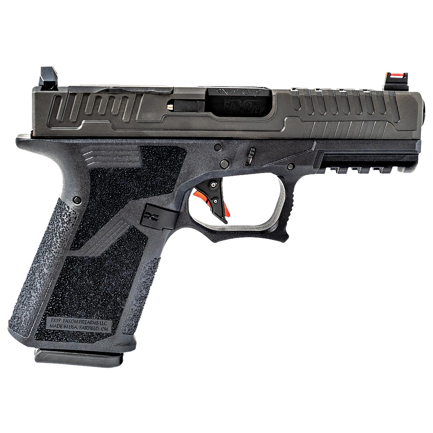 The Faxon Firearms FX-19 pistols have successfully completed a 15,000 round durability test. The pistols feature a custom Faxon PF940C frame; slide machined from 416-R Stainless steel with a DLC finish; optic cut for Trijicon RMR or Holosun 507C; machined posts in optic cuts for optic locating and recoil absorption; enhanced front, rear and top serrations on the slide; custom polished front & rear slide rails; double undercut trigger guard; extended mag release; low profile magwell and Suppressor-Height night sights. All FX-19 pistols accept Glock aftermarket parts, accessories and magazines.Includes one OEM 15rd G19 magazine and is shipped in a TSA approved hard sided case.