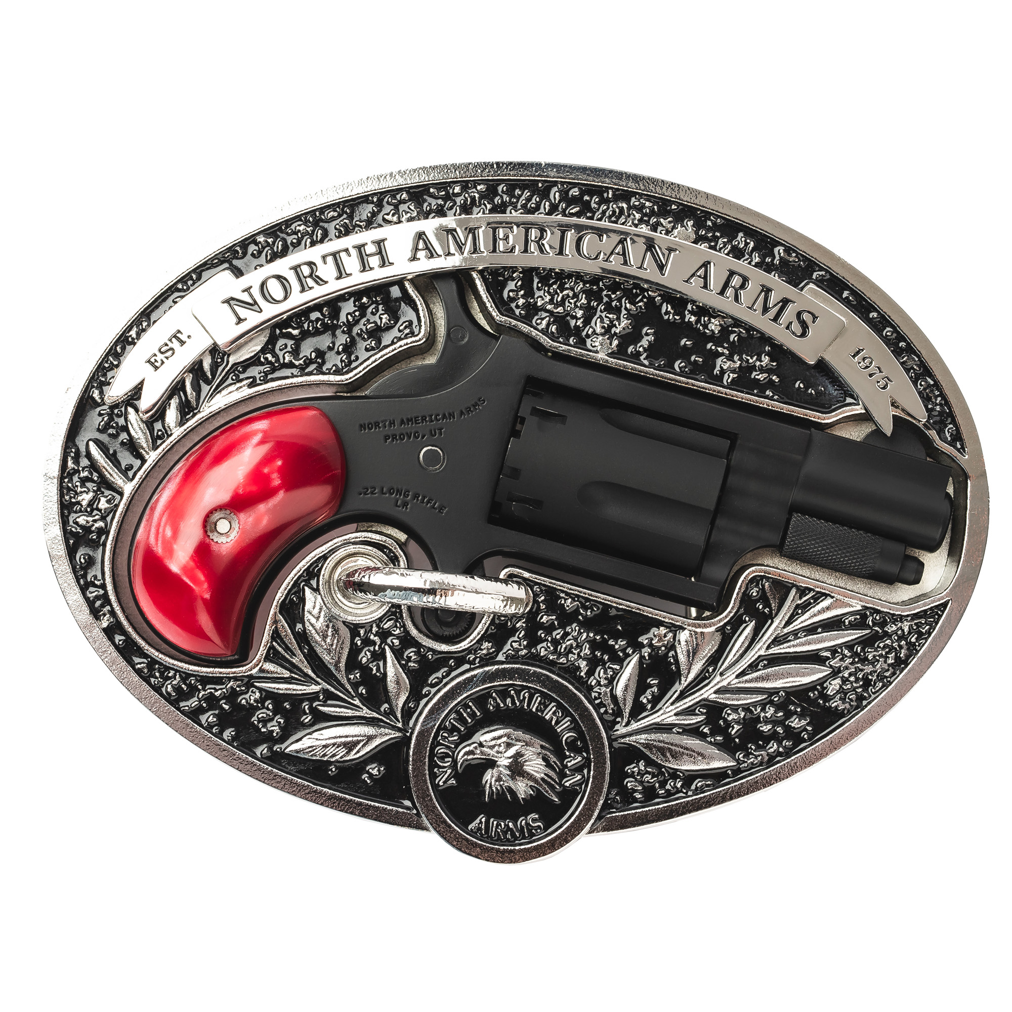 North American Arms, Zorro, Mini Revolver, Single Action Only, Revolver, 22LR, 1.125” Barrel, Matte Finish, Black, Red Grips, Fixed Sights, 5 Rounds, Includes Oval Ornate Belt Buckle