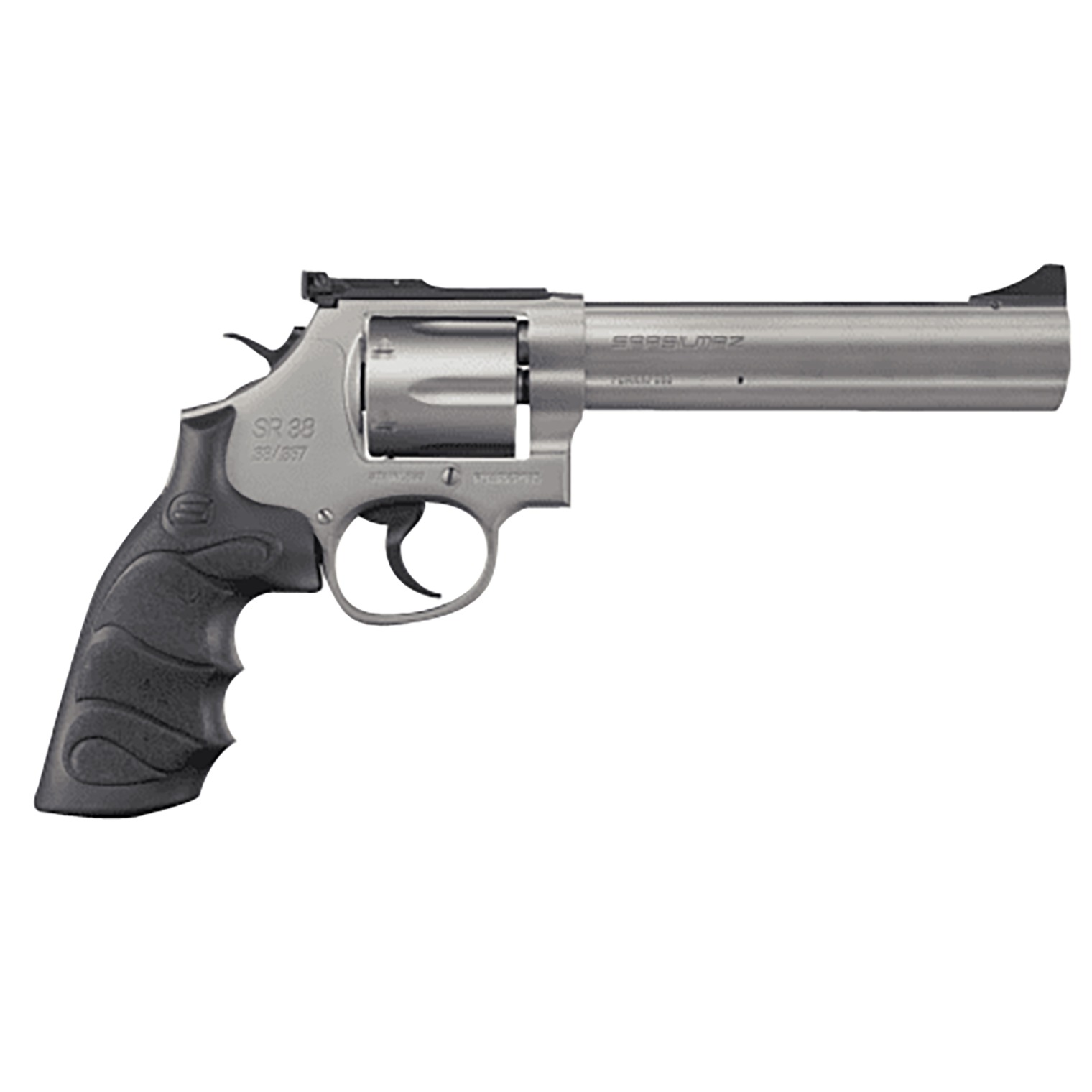 The SAR SR .357 Magnum 6 shot, traditional, double-action trigger revolvers that have an external hammer which allows these to be cocked for crisp, single-action shots. The double-action trigger pull is consistent and catch-free; the single-action is crisp and light. The revolvers feature a tall, ramp-style, changeable front sight and an adjustable rear sight; ergonomic, synthetic grip has finger grooves to improve control and handling of the revolver; drop safety and a hammer block; alloy-forged steel frame, barrel and cylinder. The barrel has a full-length underlug that also shrouds the ejection rod. These steel-framed pistols fit nicely in the hand, and due to their weight, reduce muzzle jump as well.