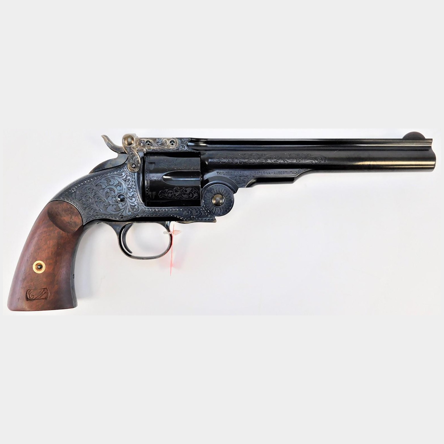 Designed by Major George Schofield to be operated with one hand while on horseback, a break-open pistol was ideal for mounted soldiers in the U.S. Cavalry. Shooters could easily eject all six spent cartridges and reload while on horseback. The top break pistol also proved useful to the likes of Jesse James and Wild Bill Hickok. The Schofield barrel latch opens by pulling it back with the thumb and includes the rear sight notch. This model features a forged steel blued frame, blued finish with various case hardened parts, and a two-piece walnut grip.