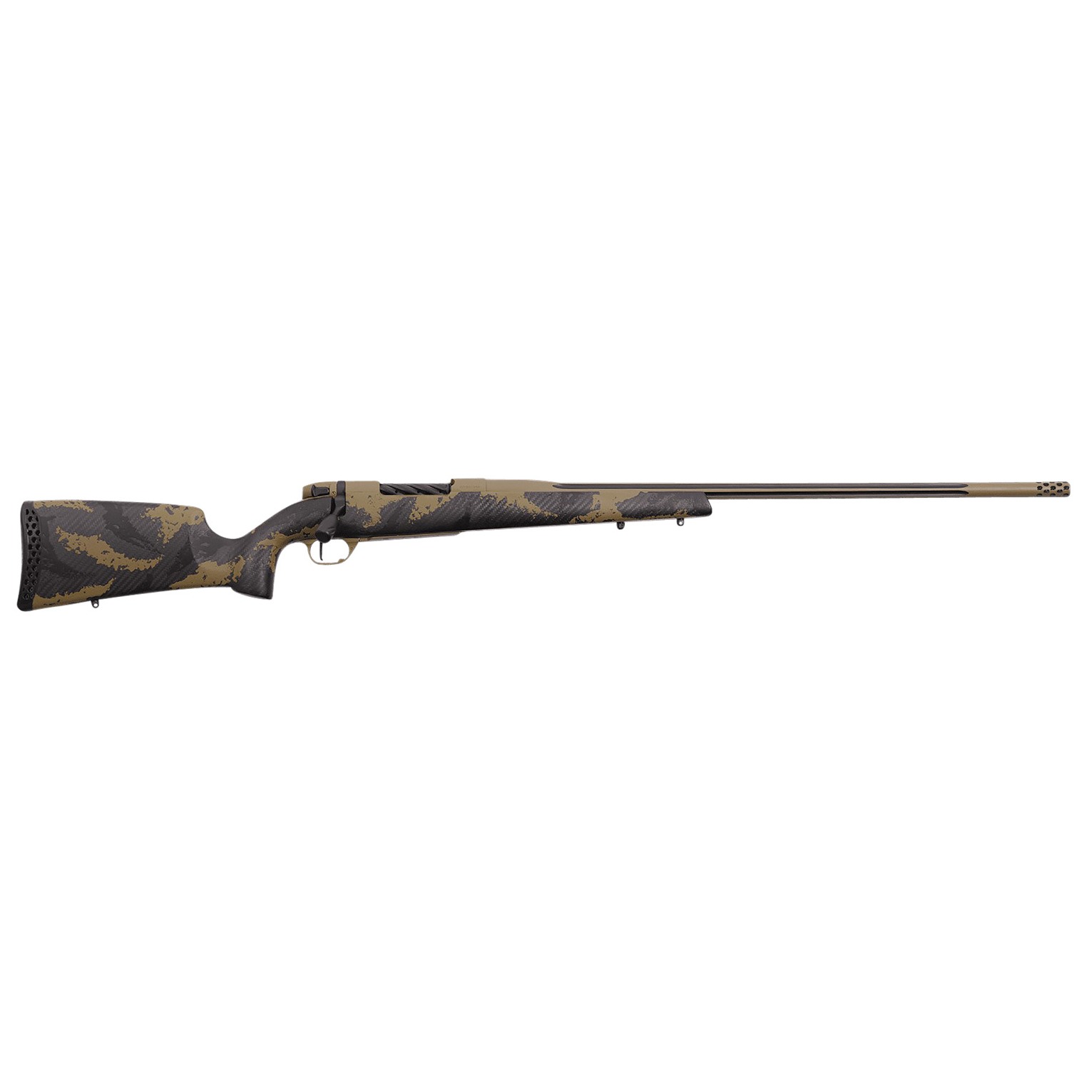 The Mark V APEX is where long-range accuracy meets lightweight hunting. Equipped with Peak 44s Bastion stock, among the lightest production vertical grip carbon fiber stocks. It features a comfortable ambidextrous palm swell and a substantial thumb groove to promote proper form while shooting. The forend features dual sling studs to allow the shooter multiple options when deciding on accessories. The second generation 3DHEX recoil pad, the first production 3D printed pad, hidden inside the pad is a series of interlocking voids that progressively collapse during recoil, expanding the time component of the recoil impulse and deadening the sharp kick of magnum chamberings. This means less felt recoil resulting in better accuracy downrange. More pronounced spiral fluting on the bolt body not only trims weight but also reduces the bearing surface within the action and results in smoother bolt function. Fit with Weatherby’s highly-effective Accubrake ST, this brake is blended to match the profile of the muzzle.