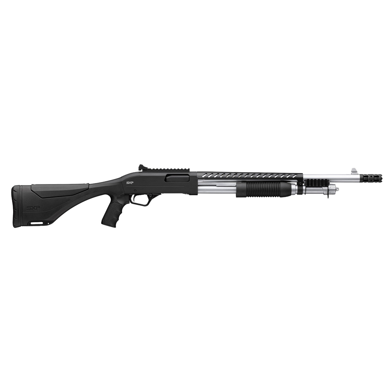 The SXP Marine Extreme Defender shotgun is designed for harsh environments. Corrosion-resistant hard chrome plated barrel, magazine tube and other components. Composite pistol grip stock and ribbed forearm. Picatinny optics base with ghost ring rear sight and blade front sight. Black Chrome finish on the bolt and slide. Features Picatinny optics rail; side mounted Picatinny rails; heat shield; reversible Crossbolt safety; Inflex Technology recoil pad; back-bored technology; and two interchangeable comb pieces to adjust drop at comb. Invector-Plus Flush Breacher choke tube included.
