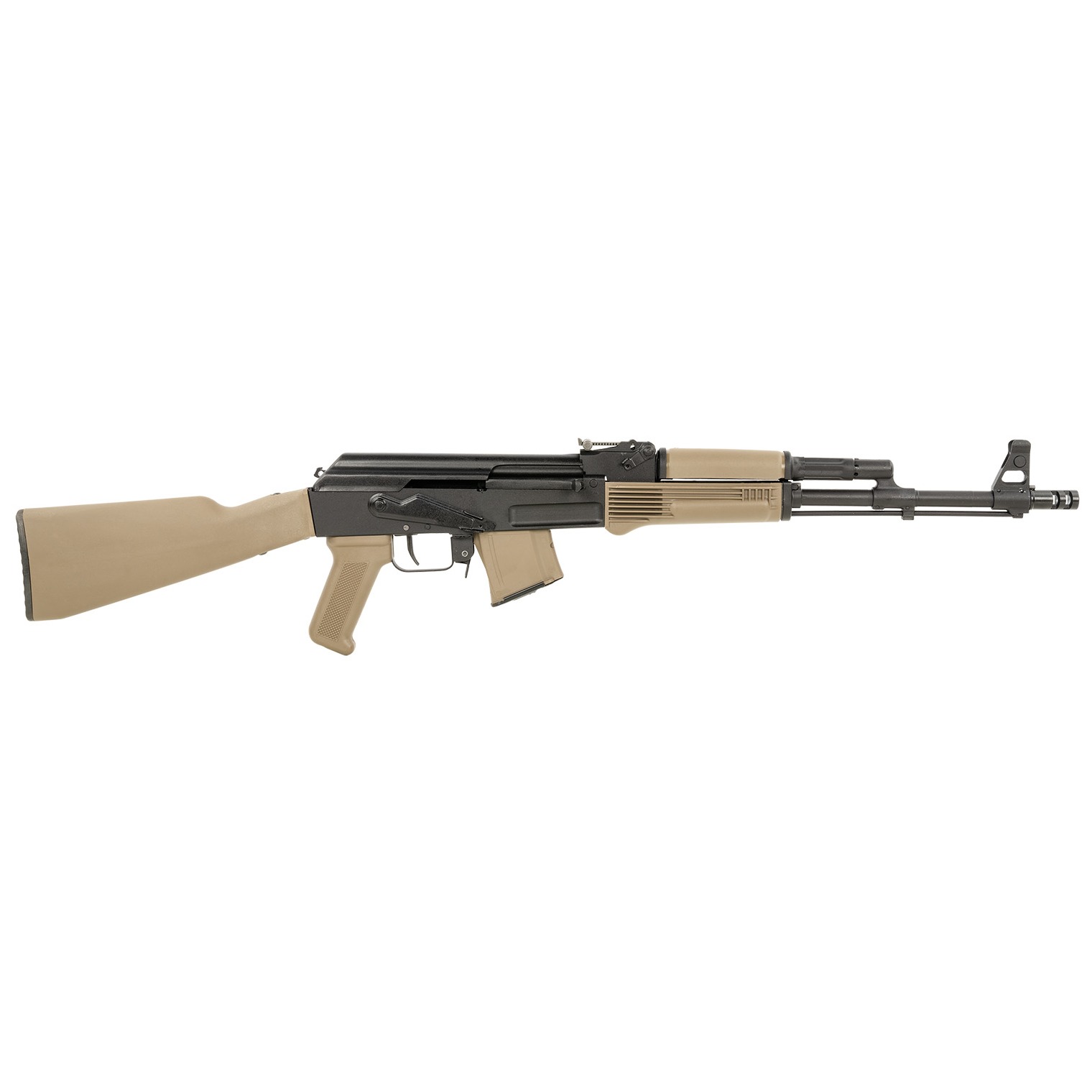 Arsenal SAM7R-62 7.62x39mm Semi-Automatic Rifle with AK-351 Muzzle Brake, milled and forged receiver, FIME Group enhanced fire control group, 16.3” chrome lined hammer forged barrel, 14x1mm left-hand threads, removable muzzle brake, cleaning rod, bayonet lug, FDE polymer furniture, intermediate length buttstock, scope rail, one 10 round magazine, sling, oil bottle, and cleaning kit. Includes: AK-351 Muzzle Brake, Bulgarian hot-die hammer forged receiver, bolt, and bolt carrier, Steyr technology cold hammer-forged 16.3” barrel from Arsenals Bulgarian factory, 14x1mm left-hand threads, Hard-chrome plated bore and chamber, FM-922EUS FIME Group Enhanced FCG, Intermediate length US-made 10” FDE polymer buttstock with cleaning kit compartment. (Total length of pull 13.4”), 922(r) compliant with US or imported magazines, Side-attached scope rail, 10 round magazine, Oil bottle, Cleaning kit, Sling