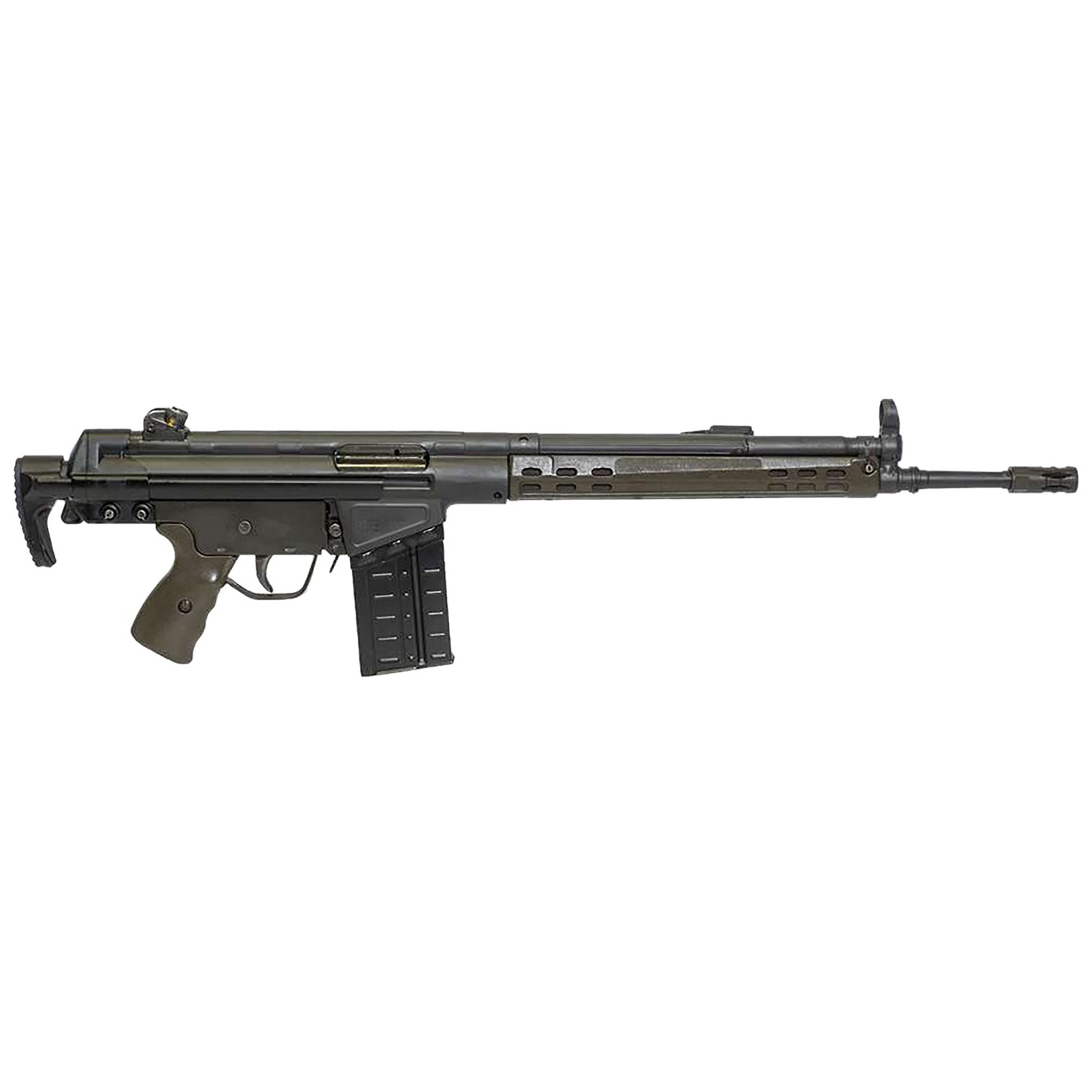 Military surplus sourced G3 Rifle w/ a roller delayed blowback system - CA-3 comes standard with original surplus parts including- - Collapsible G3 stock - handguard - adjustable front sight - rotary aperture rear sight - trigger group (modified for compliance) - bolt and bolt carrier - 1 x 20rd magazine - The new American-made components included on rifle- - trunnion - 18 inch barrel - A2 style flash hider - stamped receiver - hammer - sear - charging handle