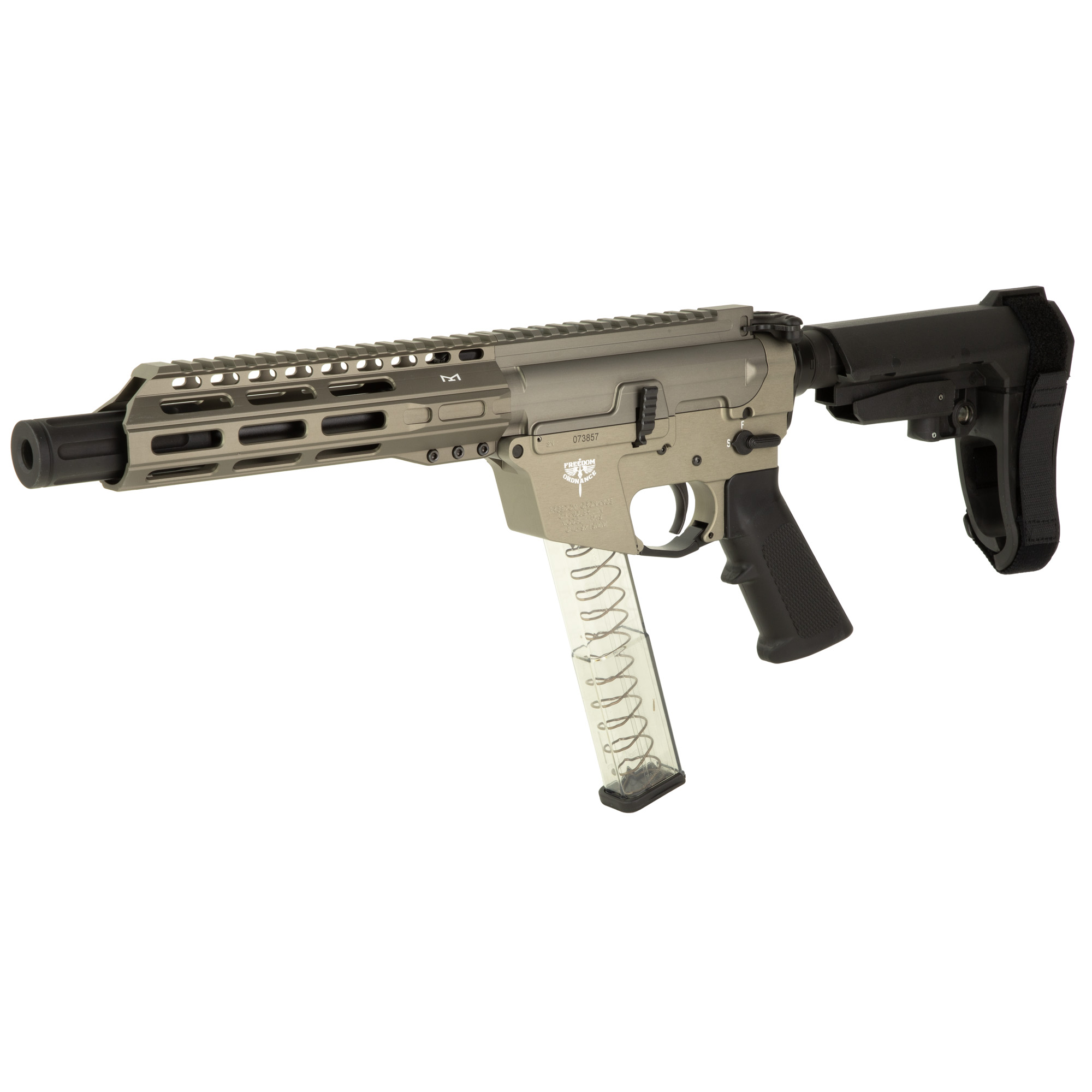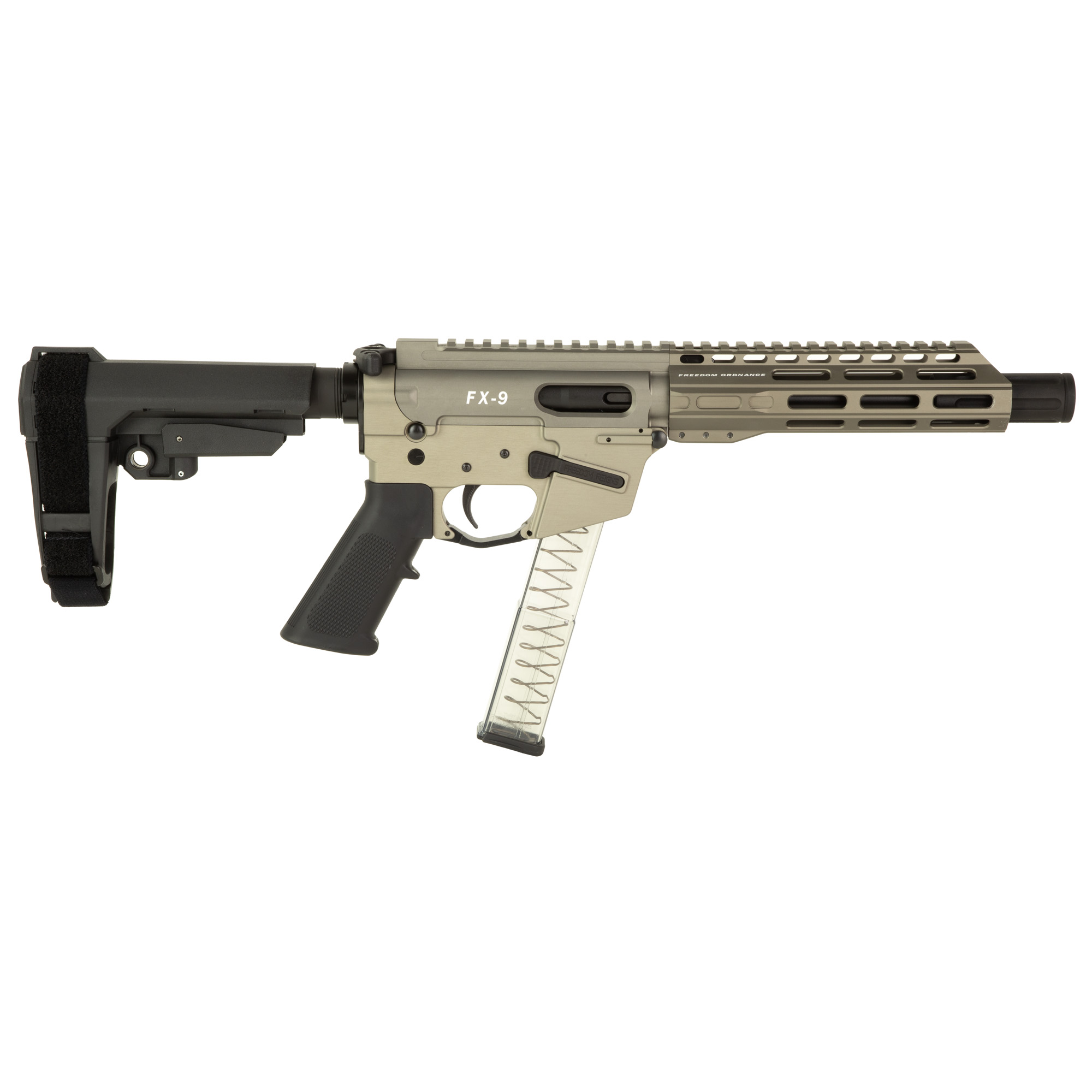 The FX-9 pistol with the SB Tactical SBA3 pistol brace installed from the factory. Equipped with a faux suppressor.