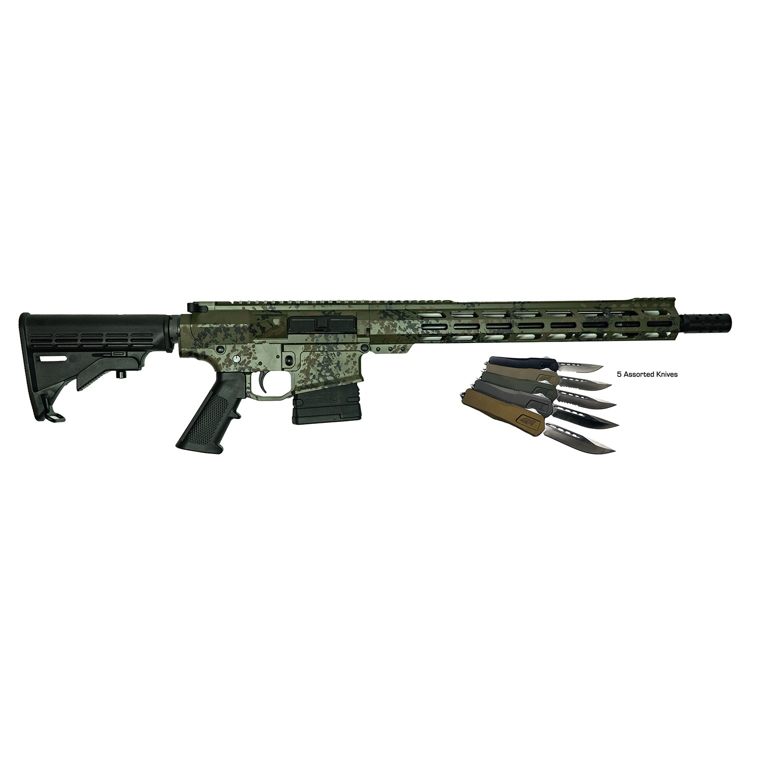 The GLFA AR10 rifles barrels have 5R rifling, as well as being double thermally stress-relieved and air-gauged. The rifle features a heavy barrel; rifle length gas tube; threaded barrel; aluminum receiver; M-LOK handguard; Picatinny rail and a Mil-spec trigger. Includes one magazine and 5 assorted SKU’s of Out The Front style knives that feature a 3.50” D2 Steel blade and a 4.50” 6061 Aluminum Grip. These come with glass breakers, belt clip and feature a premium Cerakote finish in these colors- Black, Tungsten, Bronze, FDE, and/or OD Green. They may be serrated or smooth blades.