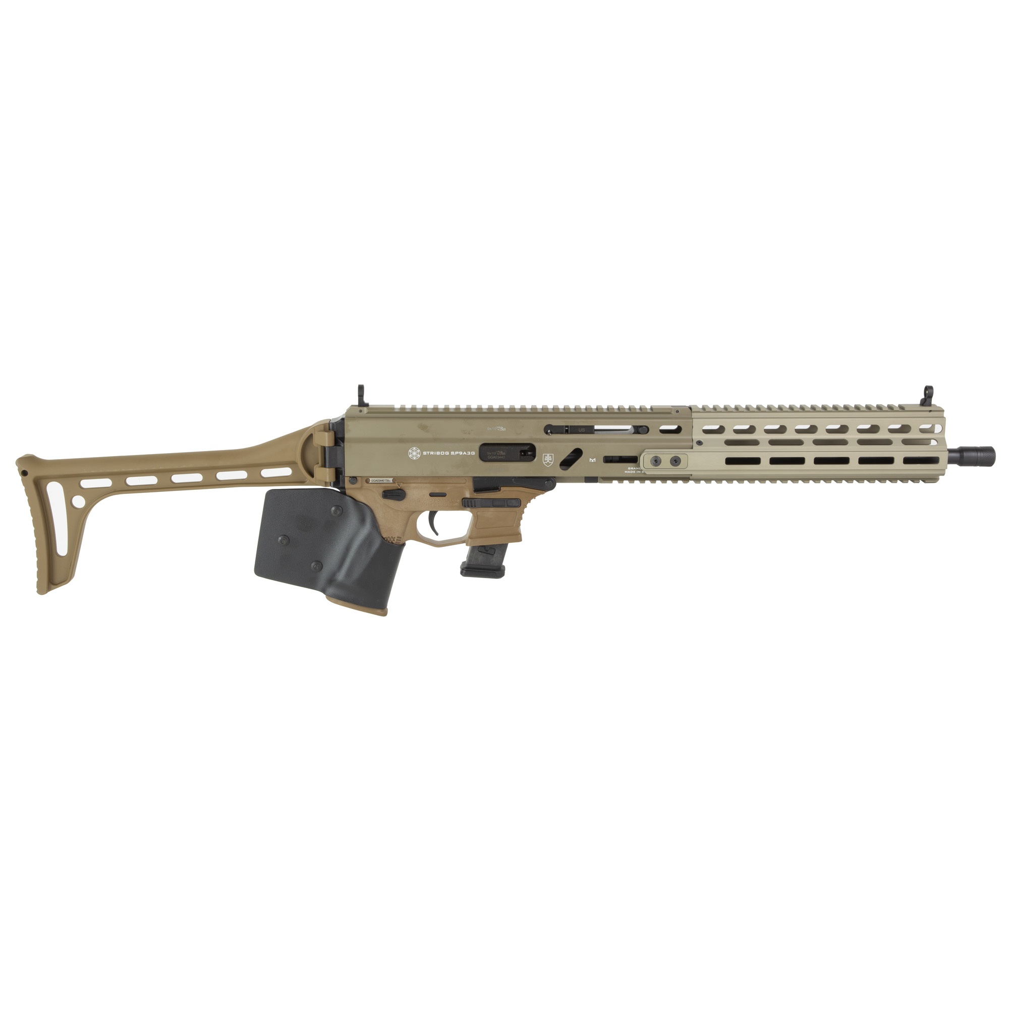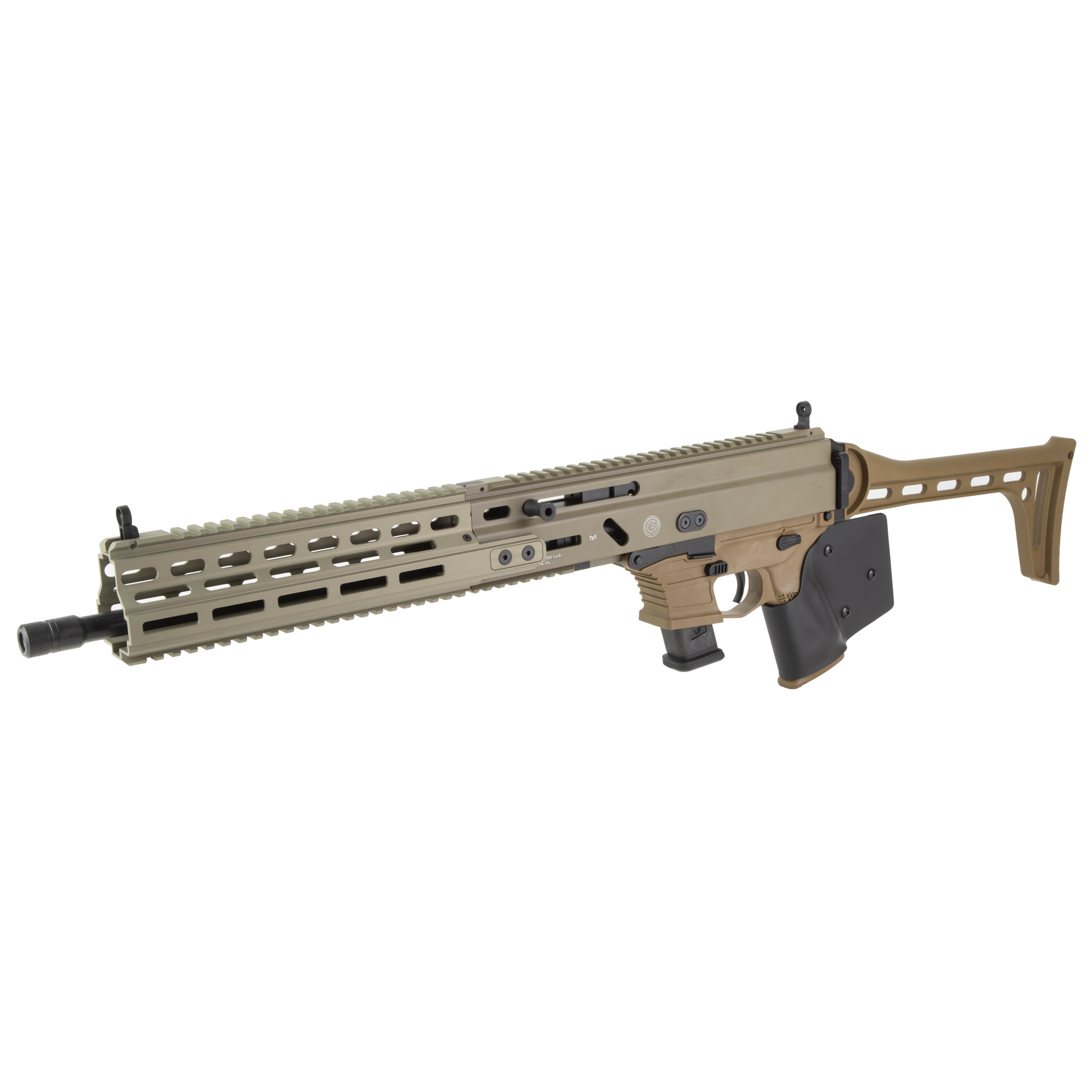 The Grand Power SP9A3G 9mm Luger rifle features a 16” barrel; M-LOK handguard; ambidextrous bolt lock/release, thumb safety; thread protector; integrated Iron sights; a non-reciprocating charging handle;1913 Picatinny rail on receiver; Glock compatible magazine and fixed stock. Includes one 10rd magazine.