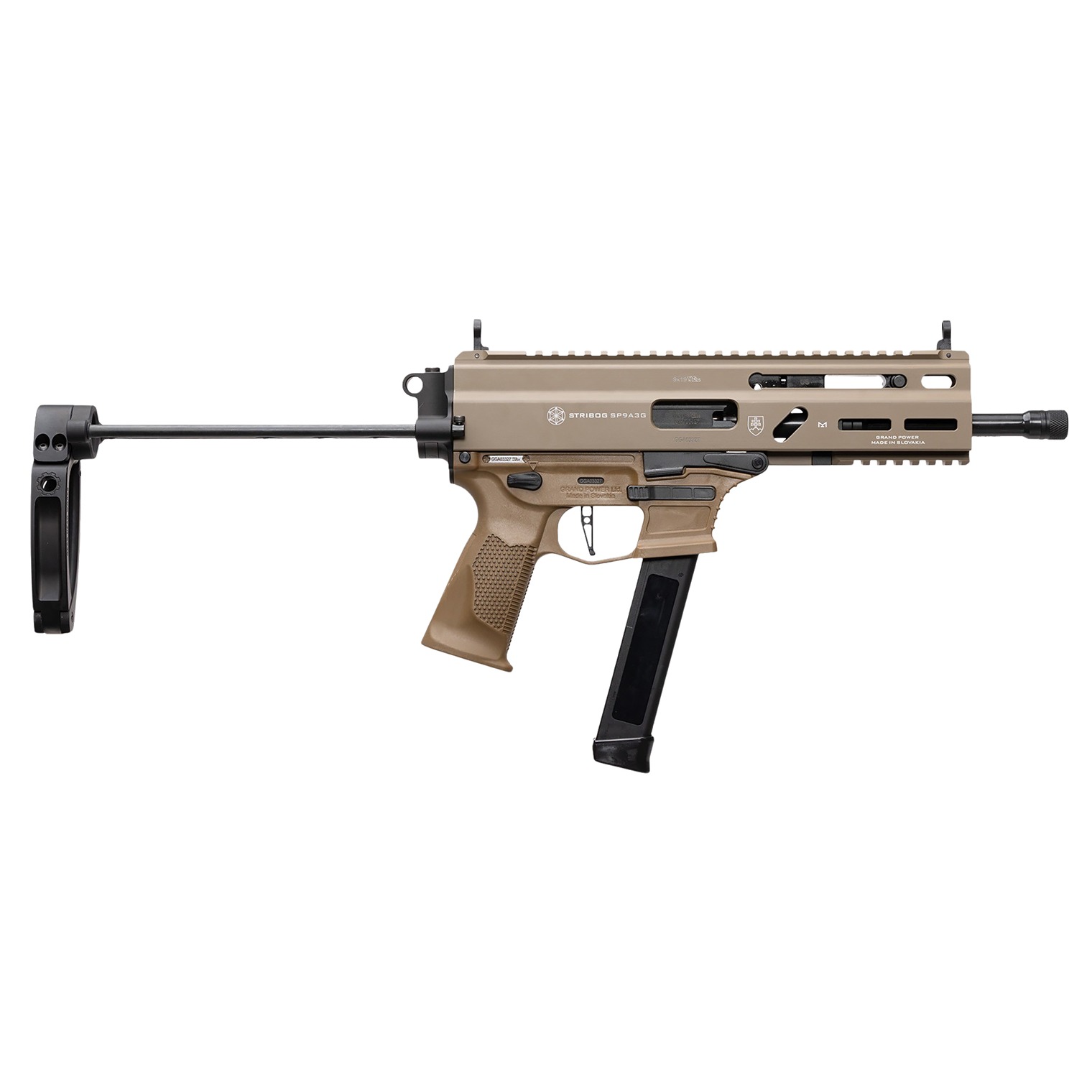 The Grand Power SP9A3G 9mm Luger pistol features a 8” barrel; M-LOK handguard; ambidextrous safety lever; a non-reciprocating charging handle; thread Protector; integrated Iron sights; 1913 Picatinny rail on receiver and PDW Tailhook brace. Includes three magazines and hard plastic case