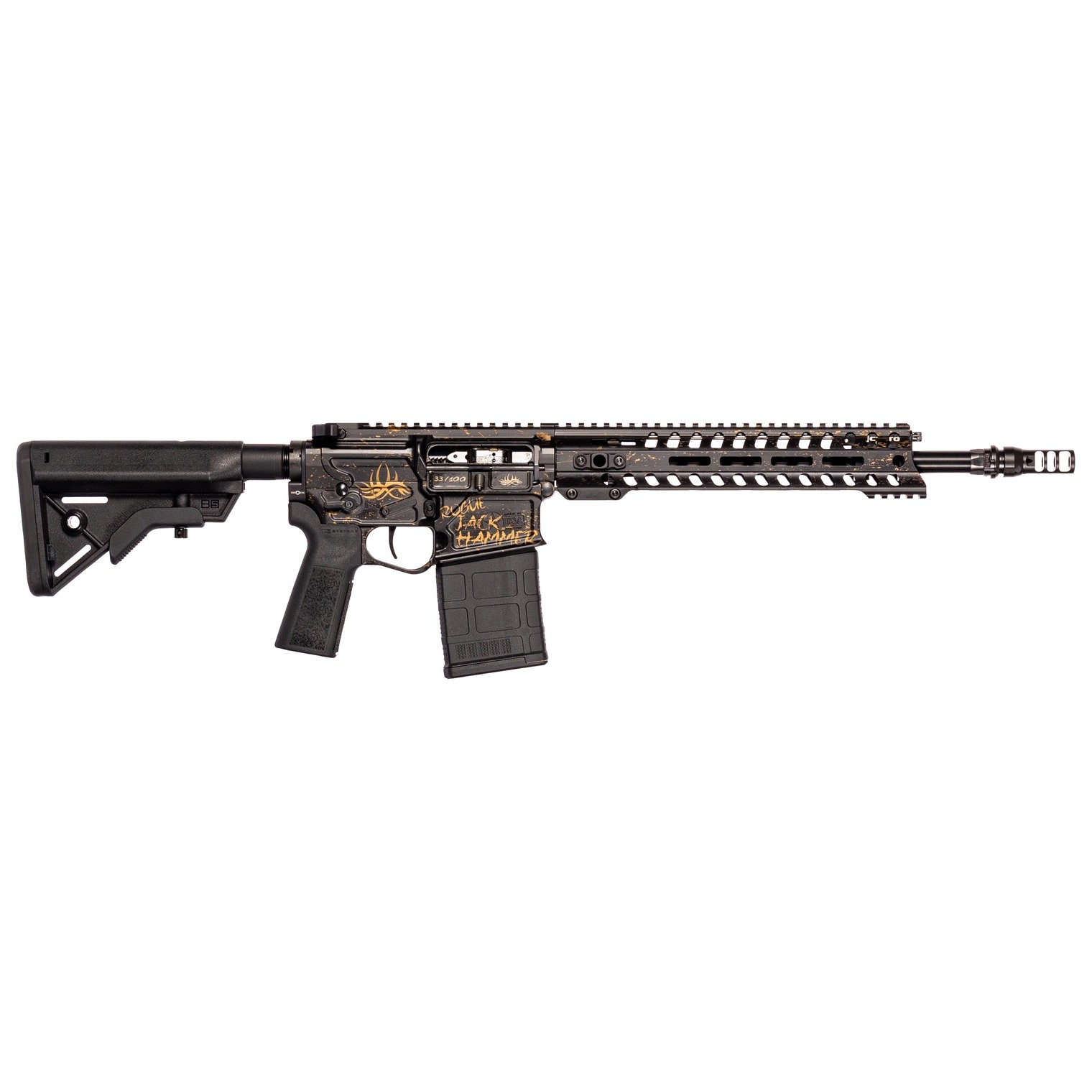 The special edition of the Rogue rifle is a limited production run based off of Bill Goldberg’s personal Rogue. The exclusive black and burnt bronze Cerakote artwork is done by CGC Cerakote. Project “Jack Hammer” was an exercise to turn the Revolution platform into the lightest .308 semi auto rifle on the market and to do it without needless “lightening” cuts. The Jack Hammer features a forged receiver set; Key-Lock BCG w/Roller Cam Pin; ambidextrous safety selector; multiple QD Sling attachment points; 11” Renegade rail with our oversized Heat Sink barrel nut and topped off with a Pinned and Welded Dead Air KeyMo Muzzle Brake to meet the 16.10” barrel length requirements. Includes COA autographed by Bill Goldberg himself.