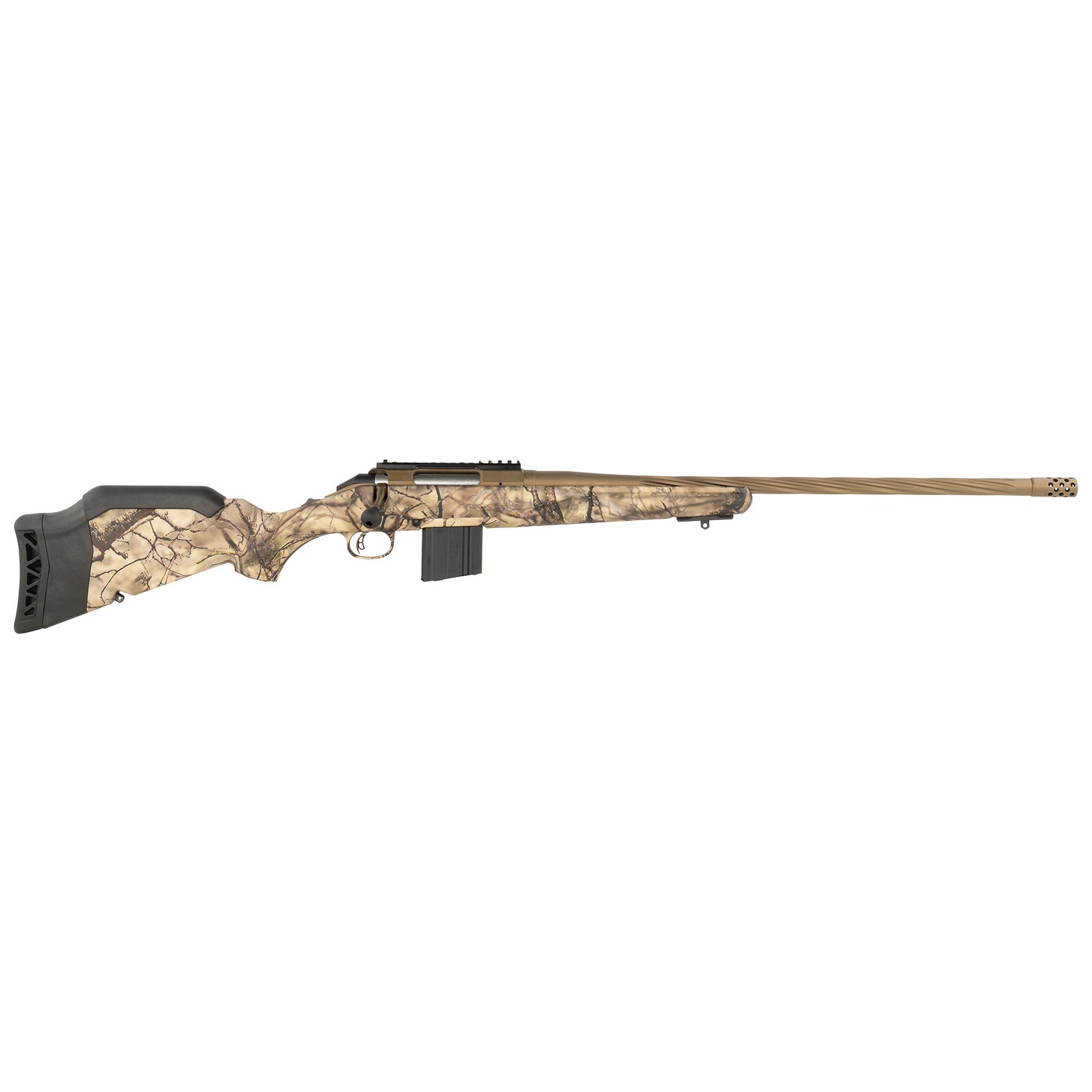 The Ruger American Gen II bolt is CNC machined from stainless steel for smooth operation and the familiar three-lug design with a 70 degree throw provides ample scope clearance. Features a splatter finished stock that provides excellent grip without being too sharp or abrasive; installed spacer allows for length of pull to be adjusted; low comb improves sight alignment when using optics; medium contour, spiral, threaded barrel; factory-installed radial port muzzle brake; 3-position tang safety; Ruger Marksman Adjustable trigger and Picatinny rail. Includes one magazine and steel sling swivel studs.