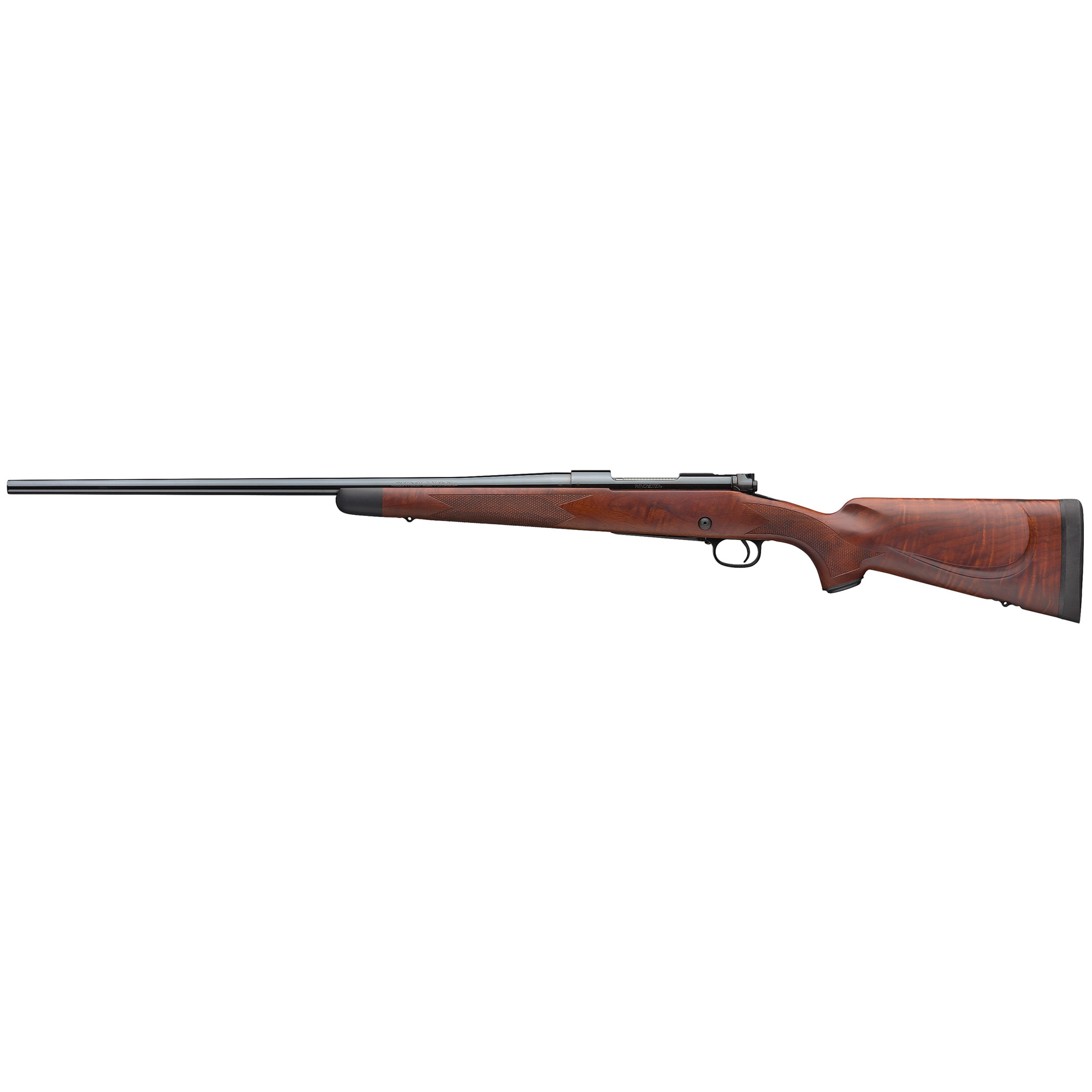 The Model 70 since 1936 it’s been the benchmark against which every other bolt-action rifle is measured. It still has the famous 3-position safety which is convenient to operate with the thumb of your firing hand, lifting the firing pin away from the sear. The forged steel receiver starts from a solid block of steel. The bottom profile of this receiver is flat to offer greater surface area for bedding. It is bedded with a two-part epoxy in two places, at the front and rear to keep things from shifting around inside the stock during firing. The classic Controlled Round Feed (CRF) bolt design is a massive claw extractor that smoothly slips onto and secures about one-quarter of the base of the cartridge. This exerts full control over the cartridge from the time it leaves the magazine, as it enters the chamber, gripping tightly until the cartridge is fully ejected. This design also allows an unfired cartridge to be extracted even if it is not yet fully chambered. The M.O.A. Trigger System is the most precise three-lever trigger system in the world and an improved fit and finish and enhanced accuracy to go along with its classic Pre-‘64 controlled round feeding. A blade-type ejector gives you full control when ejecting a fired case. Its free-floating barrel is button rifled in a process that assures superior accuracy and durability. This Super Grade model features a satin fancy walnut stock and highly polished metal finish.