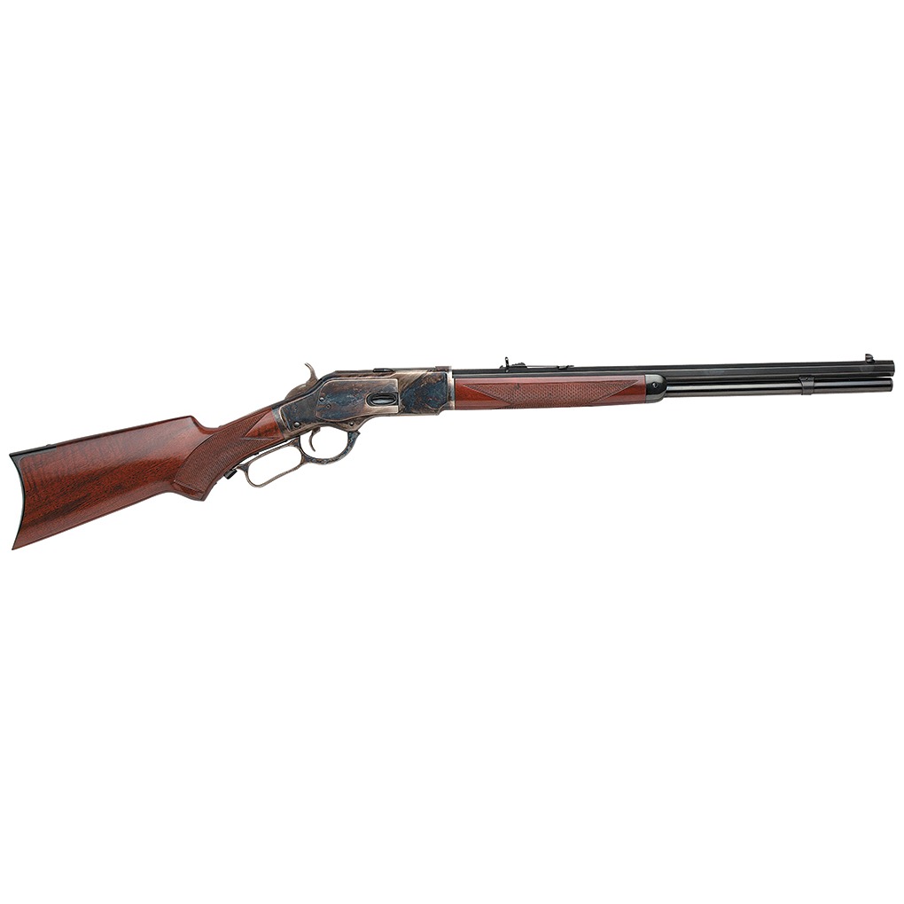 The 1873 Taylor’s Trapper is a lightweight gun that allows faster movement on target groups. It features a tapered, octagonal barrel and holds 10 rounds of .357 Magnum, as required for SASS competition. This model features a checkered walnut pistol grip stock with an 18” blued barrel, color case hardened frame, blade front sight and Buckhorn rear sight.