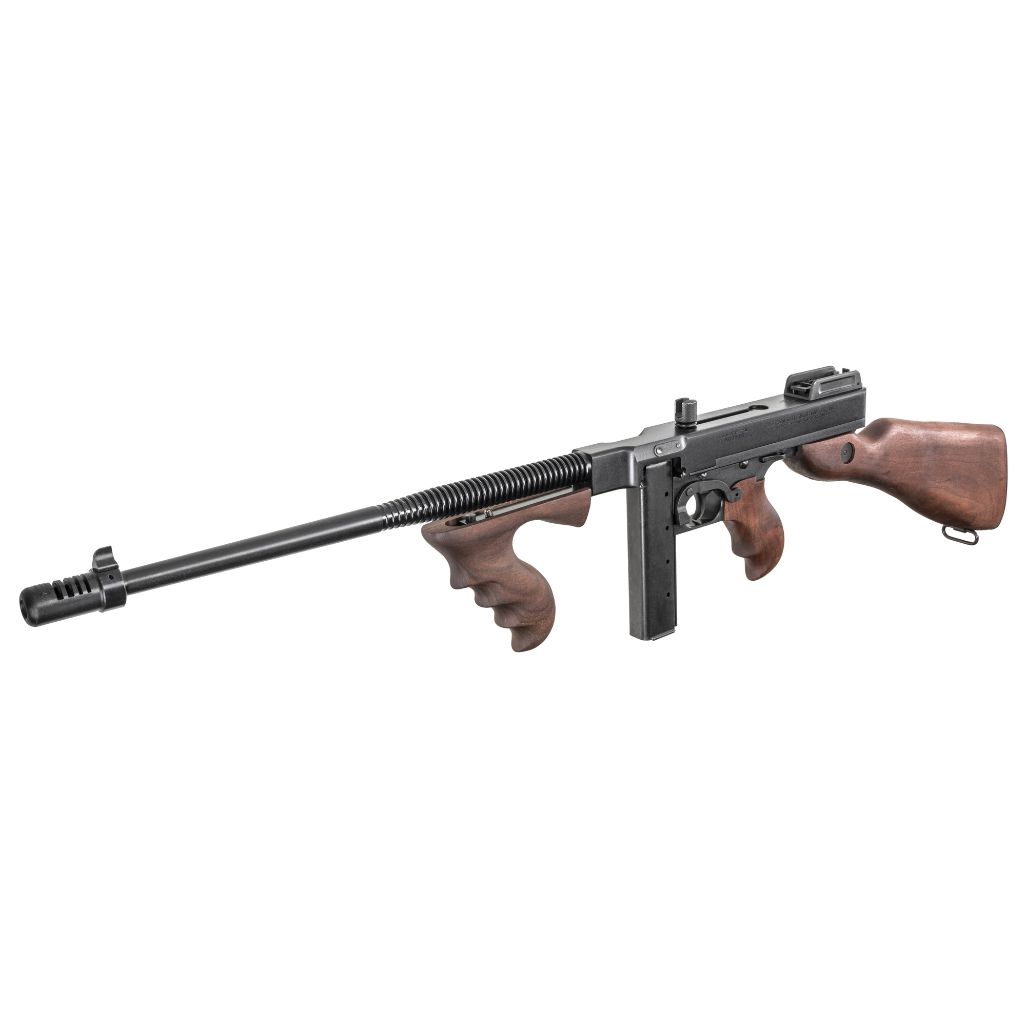 All the classic details of the time honored original are reproduced in today’s semi-auto Thompson 1927-A1. This .45 caliber carbine features a 16.5” finned barrel and genuine American walnut woodwork. It has a blade front sight with an open rear adjustable sight. This Deluxe Semi-Auto model has a pinned compensator for an 18” barrel length. The frame and receiver are machined from solid steel with a blued metal finish, and a fixed buttstock, pistol grip and vertical foregrip. It includes one 20-round stick magazine.