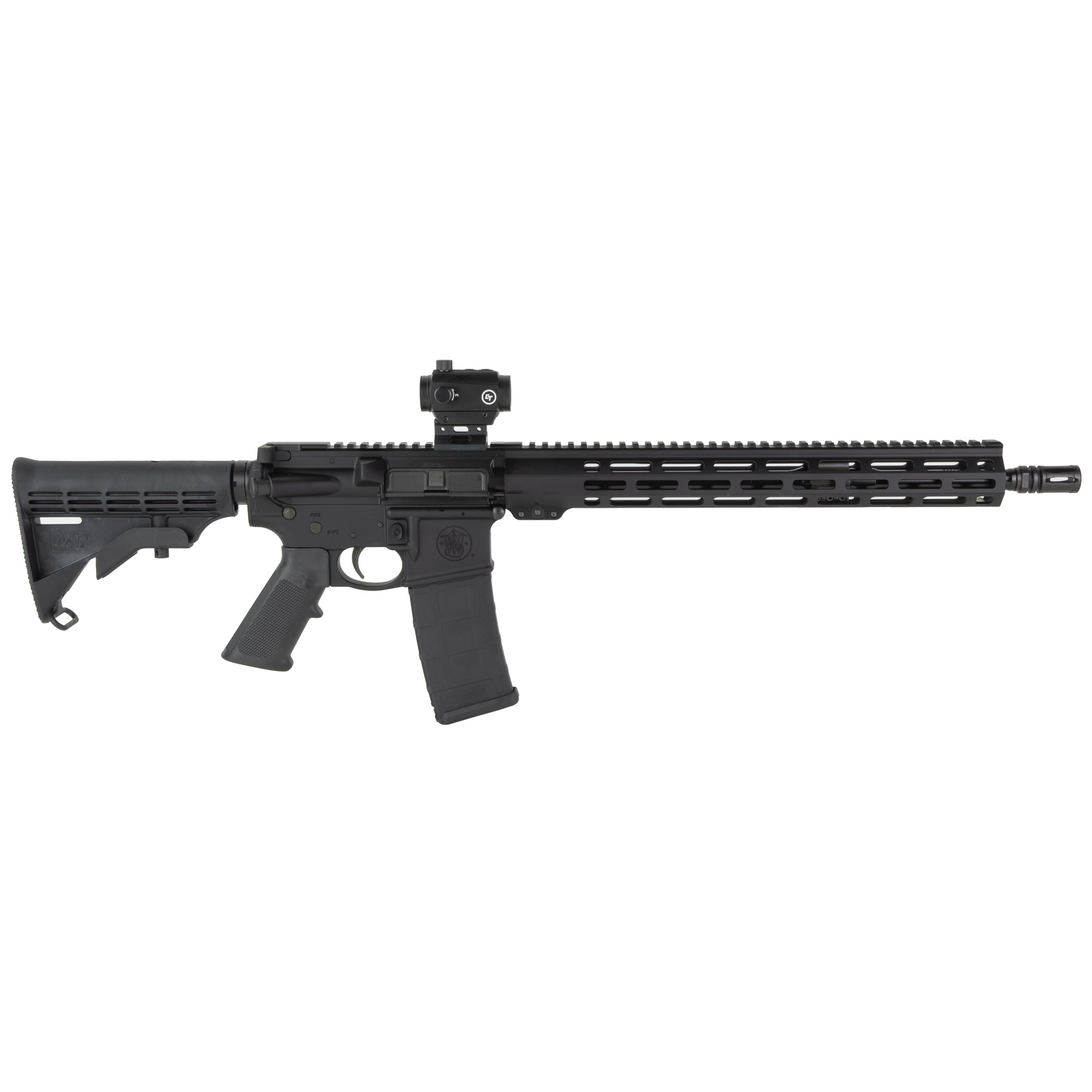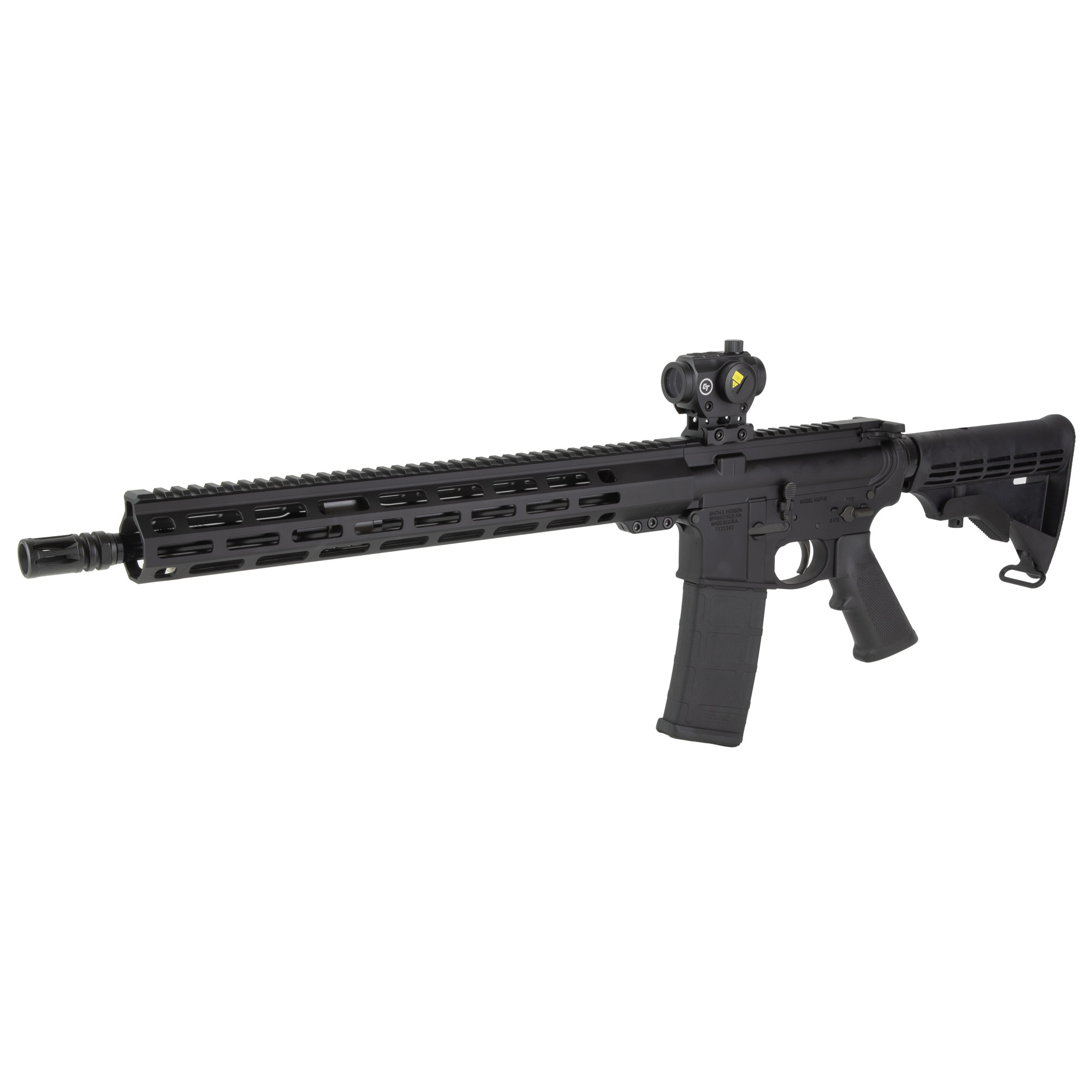 The S&W M&P15 SPORT III BUNDLE includes a Crimson Trace CT-103 red dot, a range cas, lens caps and three 30rd MAGPUL PMAG’s. Engineered for a wide variety of recreation, sport shooting, and professional applications features a 6 position adjustable stock, 15” M-LOK rail and threaded barrel.
