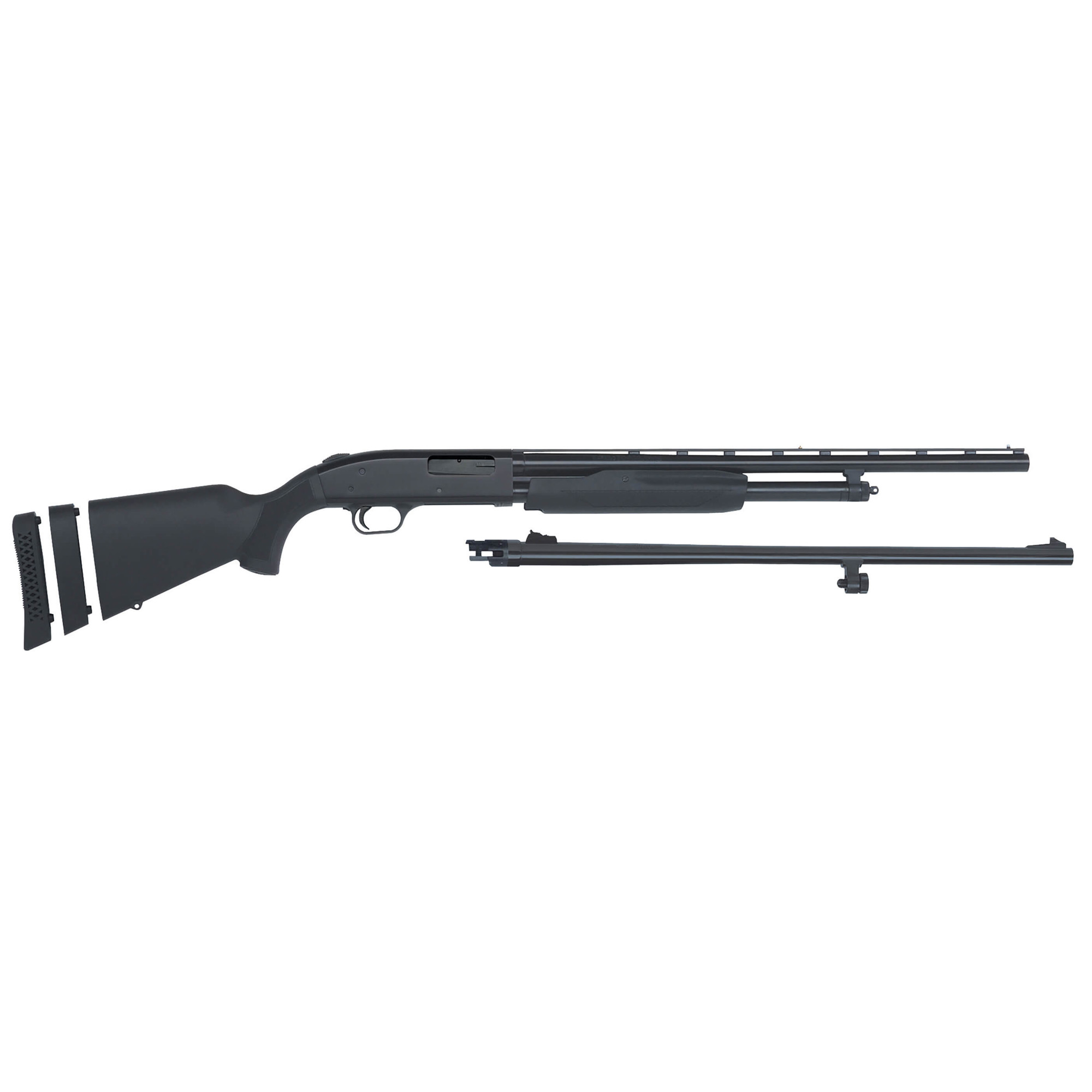 Mossberg’s 500 Youth Field/Deer Combo features a synthetic black stock with a blued metal finish. This 20 gauge combo comes with two barrels: a 24” fully rifled, vent rib with front and mid bead sights, and a 22” with rifle sights. It is equipped with a 3” inch chamber and includes an Accu-Set of choke tubes.