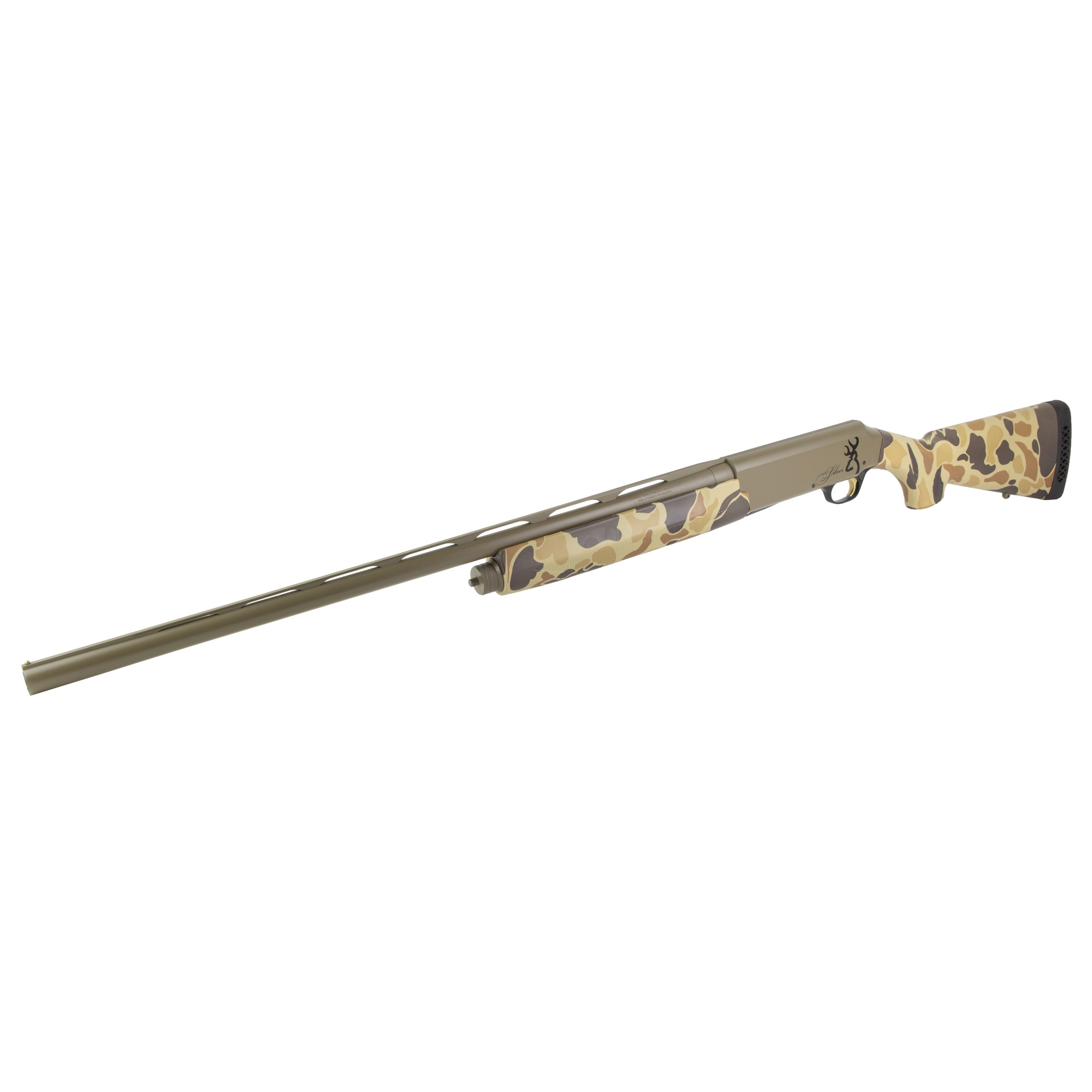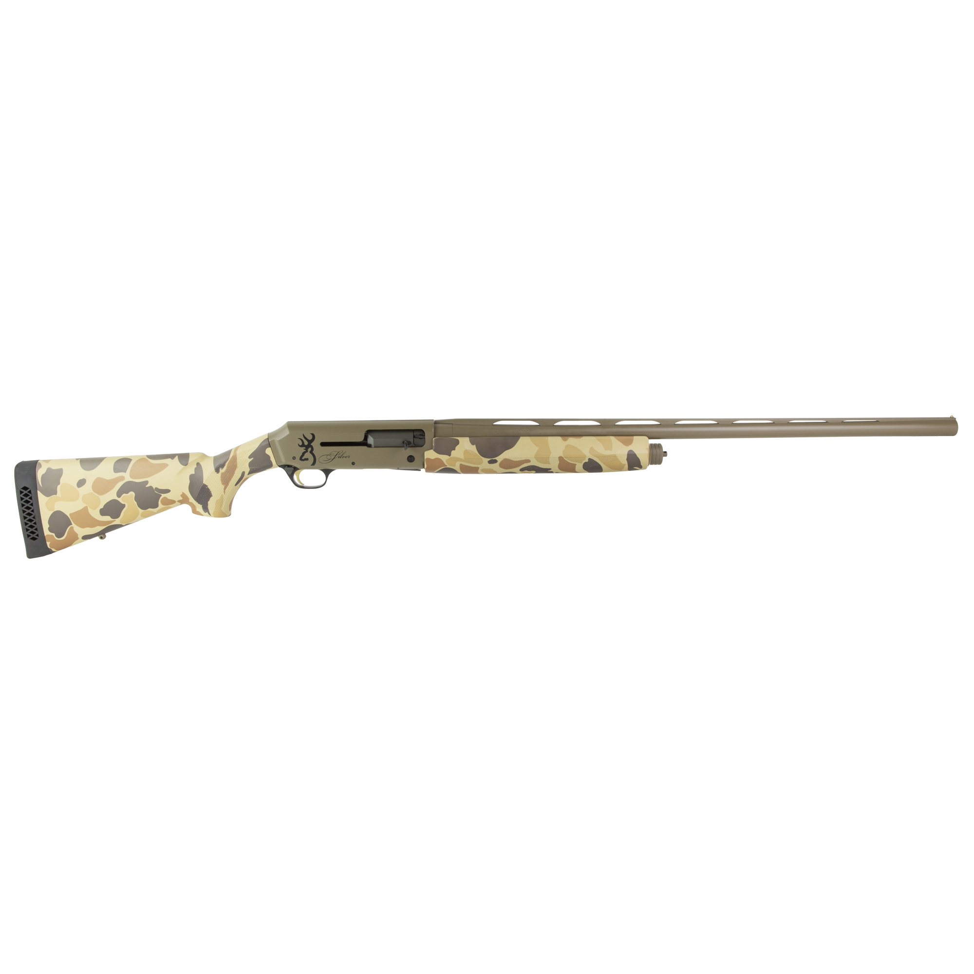 The Browning Silver shotgun is a no-nonsense, high-performance autoloader with a superb finish and unmatched handling. The self-adjusting Active Valve gas system in the Silver autoloaders uses gas from fired shells to operate the action instead of contributing to recoil. The Active Valve-equipped gas piston automatically adjusts to reliably fire a wide range of loads. The Sliver also features a gold-colored trigger and semi-humpback receiver. This Field model features a flat dark earth receiver/barrel and Vintage Tan camo stock.