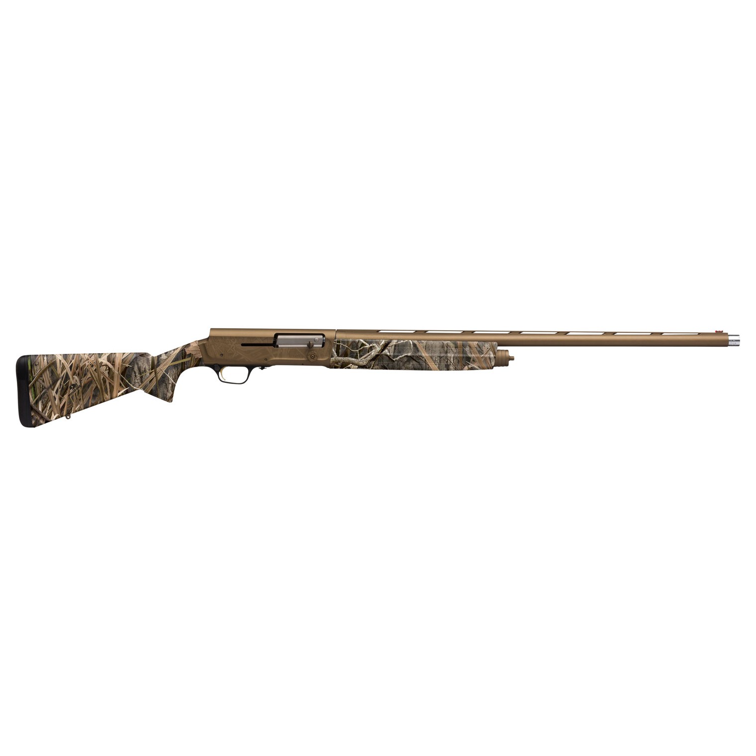 The A5 is built on a smaller, lighter receiver for reduced weight and a sleek feel in your hands. It feels incredibly balanced by placing your front hand closer to the bore line for superior hand-eye coordination and pointability. This autoloading shotgun makes better use of kinetic energy with its powerful, short recoil-operated Kinematic Drive System. Kinematic Drive harnesses recoil energy and converts it into the mechanical motion needed to operate the action. Operation is clean because gases are sent out the barrel and away from the action. The familiar humpback receiver profile melds seamlessly with the rib to extend your sight plane, aiding in natural sight alignment for quicker target acquisition. It also benefits from the advantages of Browning’s Total Barrel Dynamics and the Invector-DS choke tube system to extract the most performance from this revered gauge, come hell or high water. The Browning A5 Wicked Wing features a Mossy Oak Shadow Grass Habitat finish stock, fiber optic front sight, cerakote burnt bronze receiver and barrel.