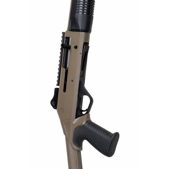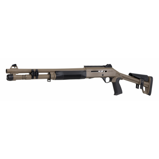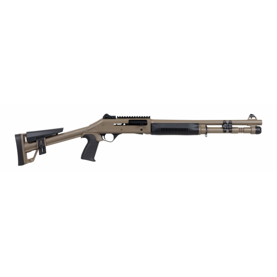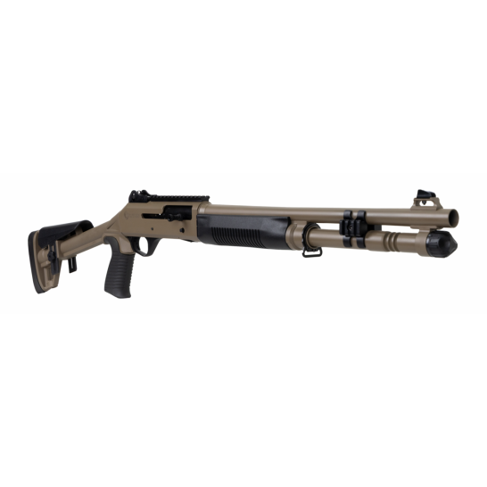 Experience the legend of the Panzer M4 Tactical semi-auto shotgun - a true epitome of rugged reliability, ideal for adverse conditions. This light, durable, and fast-handling firearm boasts the famous A.R.G.O Piston-driven semi-auto action, cycling everything from target loads to hefty 3-inch magnums. With an extended mag tube featuring sling attachment points, a top rail for optics, and ghost ring sights as standard, the M4 Tactical is finished with a fixed skeletonized stock and FDE finish, making it a stunning and reliable choice