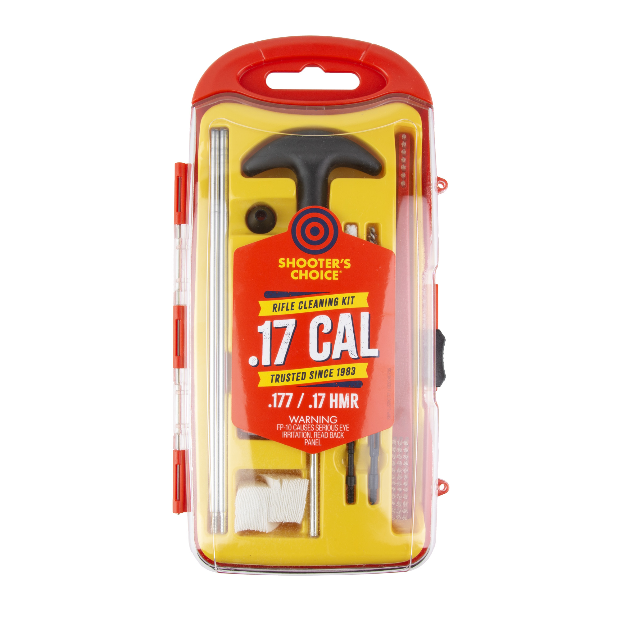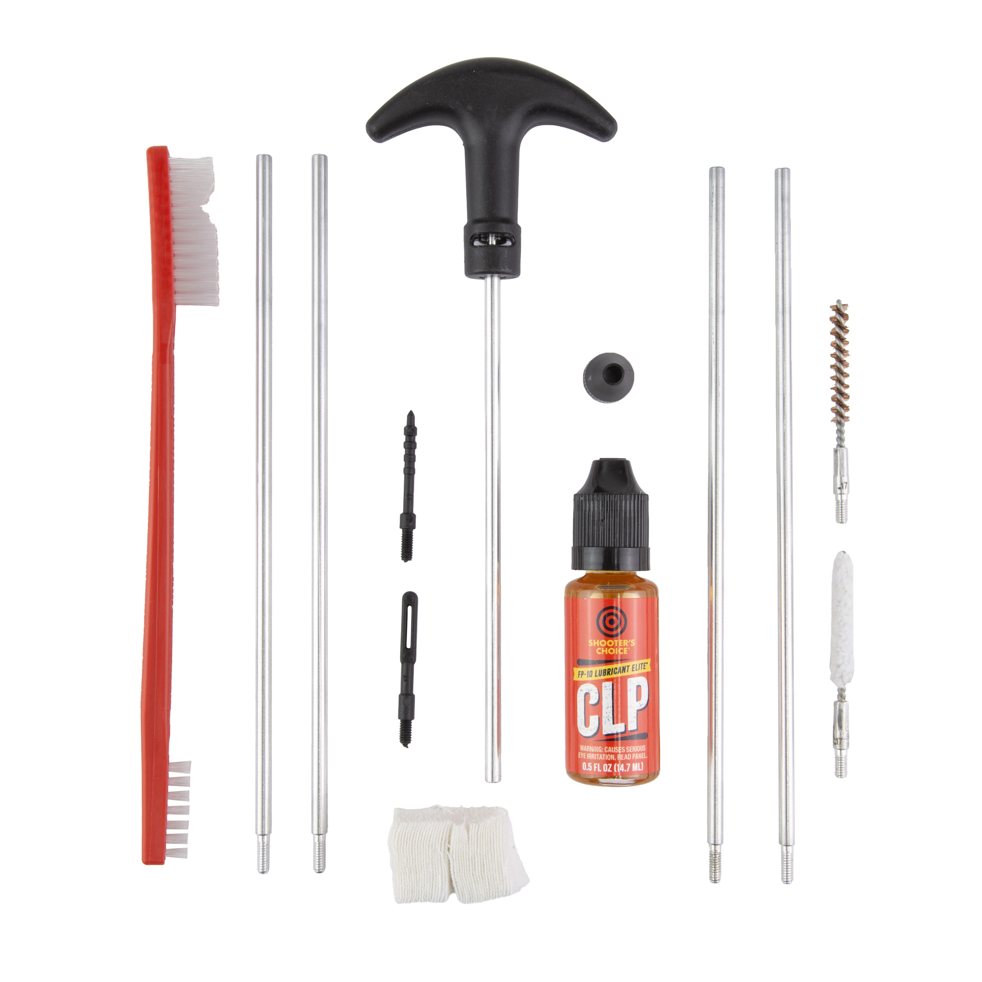 Shooters Choice 17Cal Rifle Cleaning Kit contains quality components that wont damage firearms while cleaning. Includes aluminum rod set with swivel t-handle along with a brush, mop, jag, slotted tip, bore guide and patches. An all purpose brush and bottle of FP-10 Lubricant Elite CLP is also included to keep firearms properly lubricated and operating smoothly.