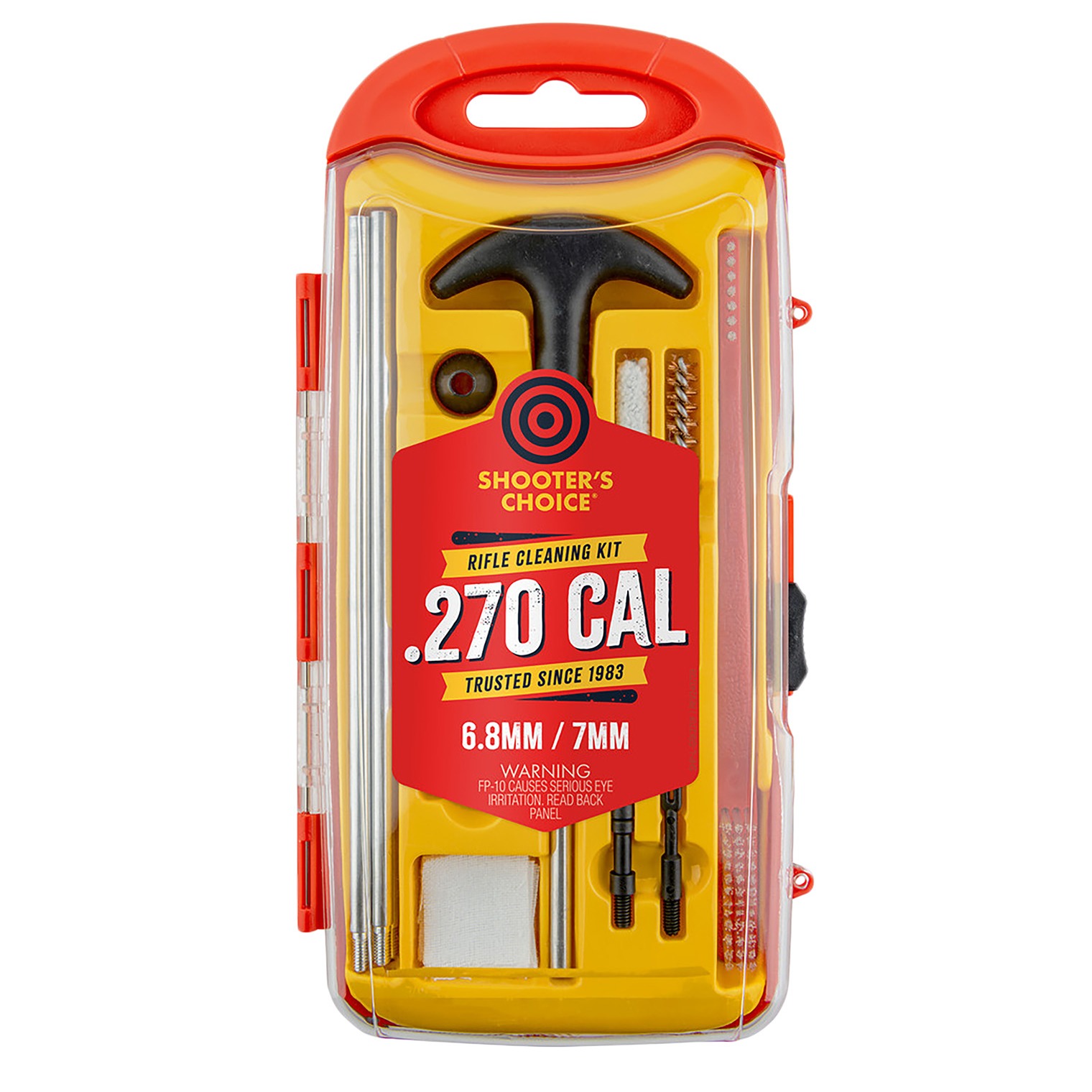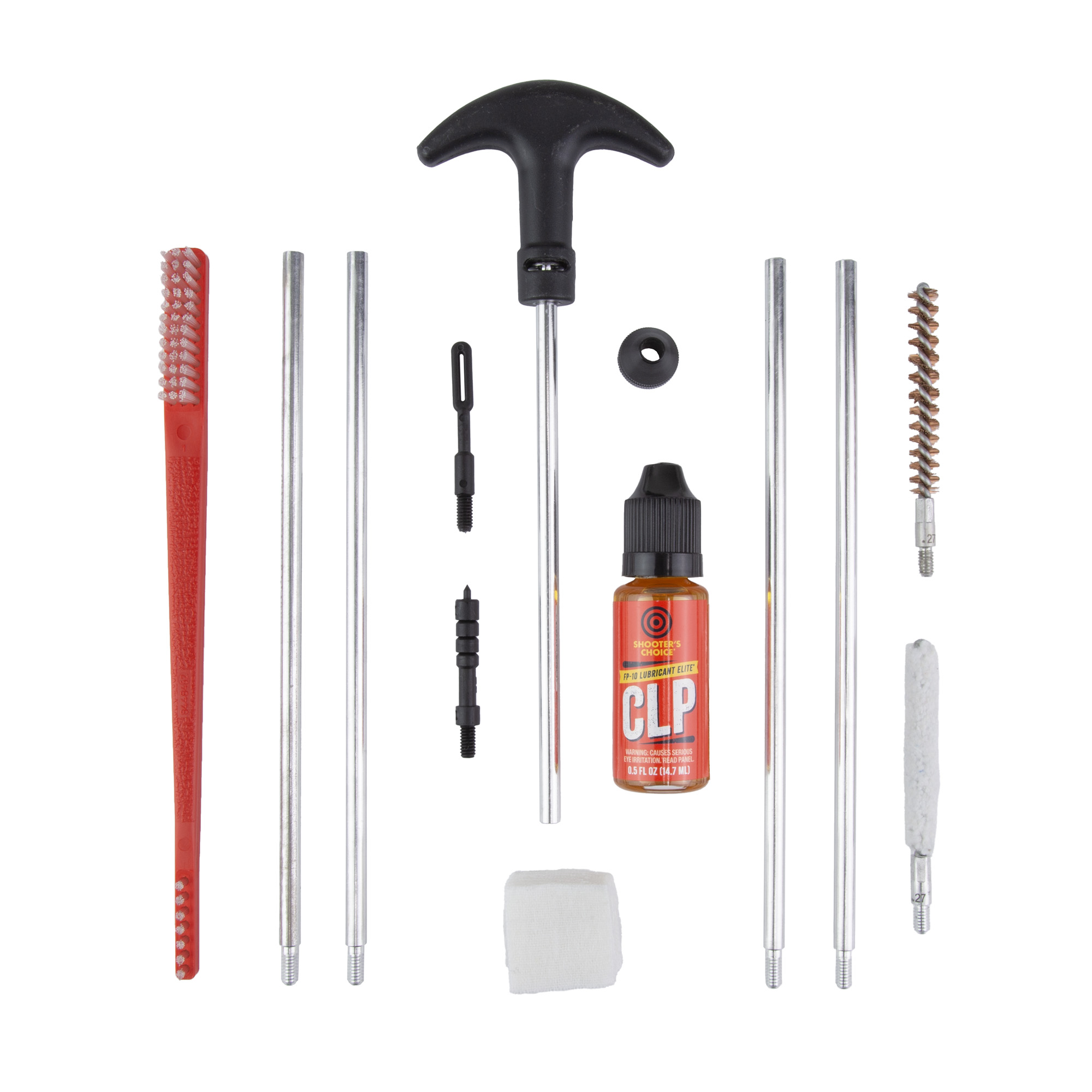 Shooters Choice 270Cal Rifle Cleaning Kit contains quality components that wont damage firearms while cleaning. Includes aluminum rod set with swivel t-handle along with a brush, mop, jag, slotted tip, bore guide and patches. An all purpose brush and bottle of FP-10 Lubricant Elite CLP is also included to keep firearms properly lubricated and operating smoothly.