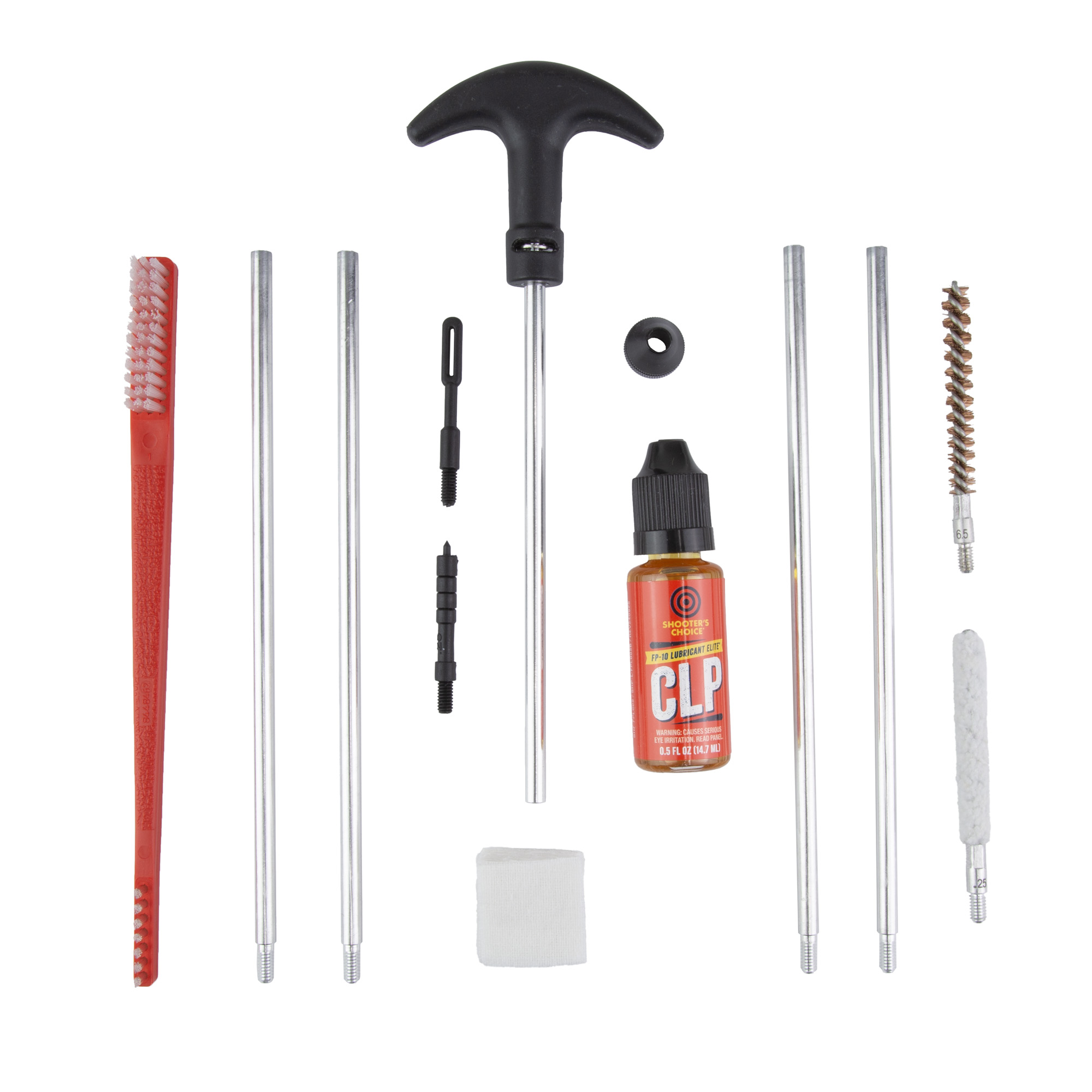 Shooters Choice 6.5mm Rifle Cleaning Kit contains quality components that wont damage firearms while cleaning. Includes aluminum rod set with swivel t-handle along with a brush, mop, jag, slotted tip, bore guide and patches. An all purpose brush and bottle of FP-10 Lubricant Elite CLP is also included to keep firearms properly lubricated and operating smoothly.