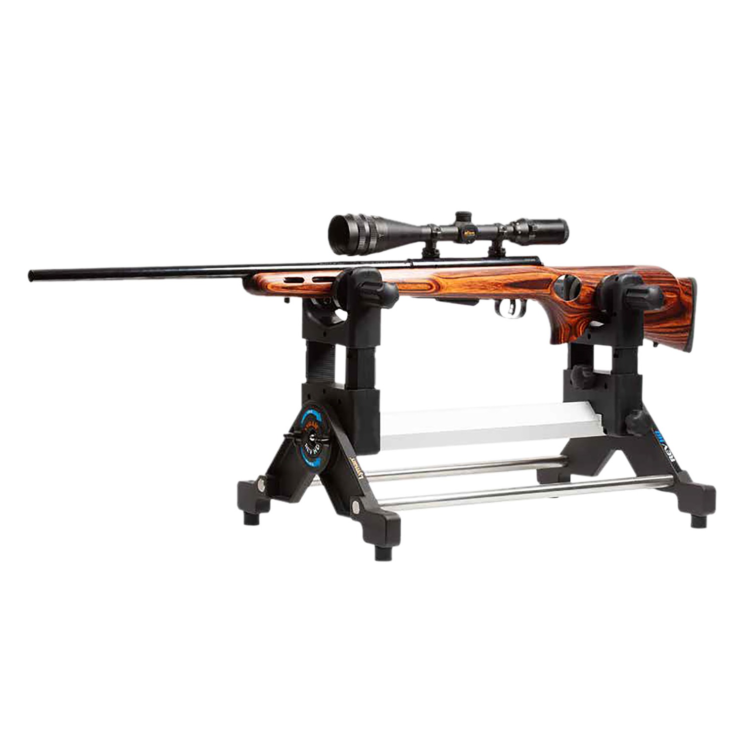 A 16 1/2 pound heavy duty rotating vise for all gun care needs. The Revolution HD Gun Vise starts with sturdy aluminum frames and center beam, along with stainless steel connecting rods. These critical metal parts give the vise the added strength and stability gun owners are looking for. The vise can be rotated 180 degrees and locked in position every 6 degrees, which provides extreme versatility in positioning firearms in the right spot. The padded gun clamps offer 2 of height adjustment and can be positioned from 3 to 17 apart. The Rev HD also features adjustable feet for a stable working platform on various surfaces. Plus, the Rev HD comes with an AR magazine well support post which spreads to lock firmly into the rifle, preventing unwanted movement.