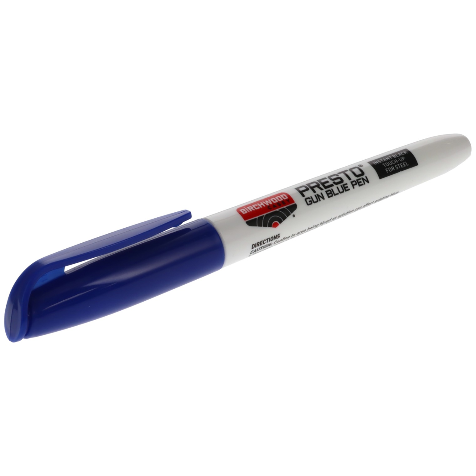 The fastest and easiest way to touch up nicks and scratches is with a simple easy to use Presto Gun Blue Pen. It penetrates hard steel instantly and gives a durable blue black finish that will not rub off. Use like a marking pen for one coat coverage on non-stainless steels.