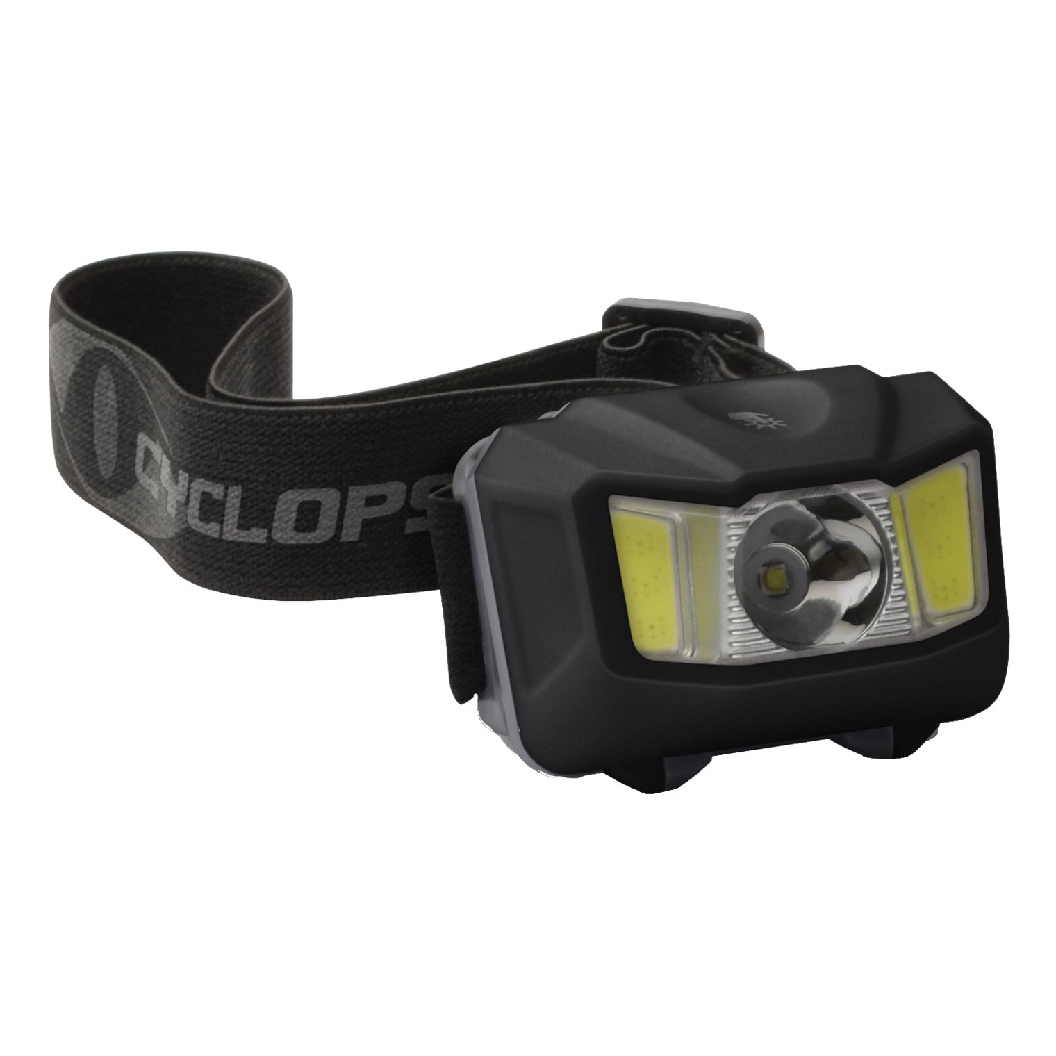 Cyclops Hero Headlamp features an on/off touch pad that is completely silent and will not accidentally turn on when stowed away. It has a 255 lumen center white LED, side white 100 lumen and a 25 lumen green LED COB side. Includes three AAA energizer alkaline batteries.