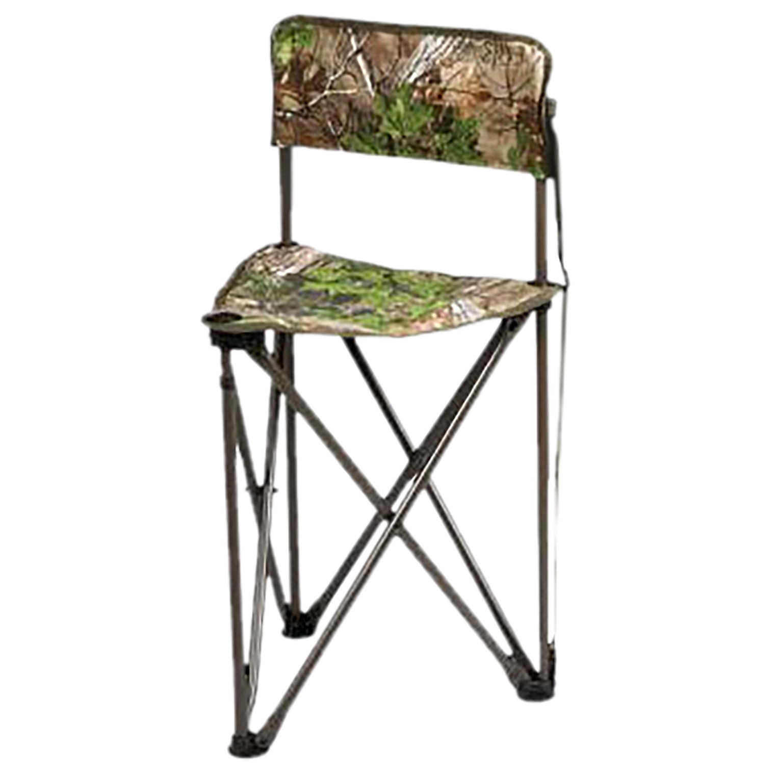 The Tripod CamoChair is ideal for hunting in a blind, fishing from a bank, and many other outdoor activities. Lightweight and collapsible with a carry strap for easy transport, this essential hunting accessory features a Realtree Xtra Green polyester triangular seat with back. Dimensions: 30 tall; 19.5 seat height; seat measures 15 x 17