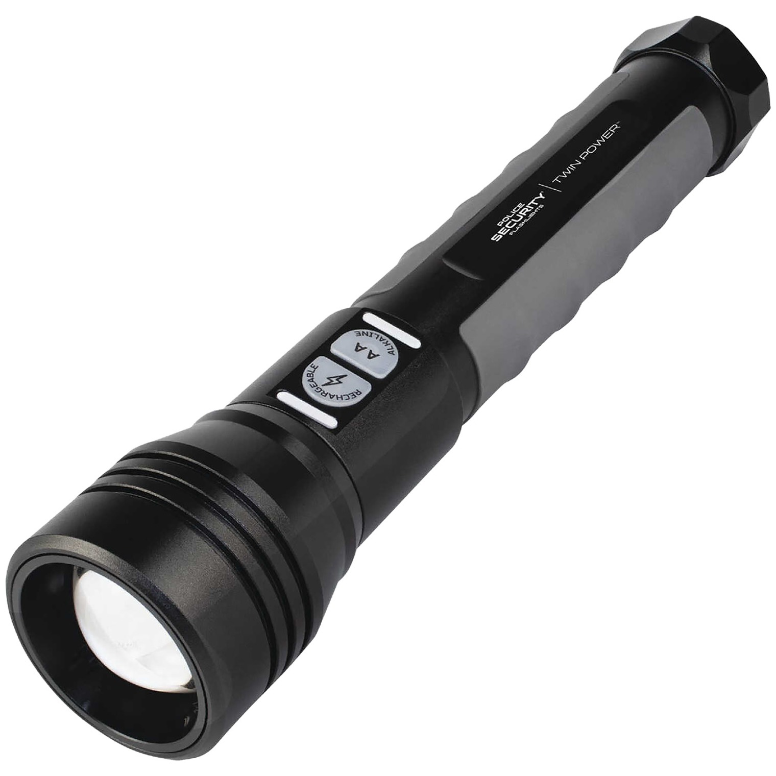 Police Security’s Twin Power flashlight is a groundbreaking, patent-pending, ultra-bright 2000 lumen flashlight that redefines traditional Dual Power flashlights. Unlike Dual Power, which requires two separate battery cartridges, the Twin Power flashlight operates seamlessly with a SINGLE cartridge. The cartridge holds a built-in 21700 rechargeable battery for primary power, and 3AA alkaline batteries for backup. With this innovative design, you’ll never face the dilemma of drained power. Simply toggle between alkaline and rechargeable battery sources with the touch of a button, ensuring uninterrupted illumination whenever you need it. Equipped with battery level indicators, this flashlight guarantees you’ll never be left in the dark.