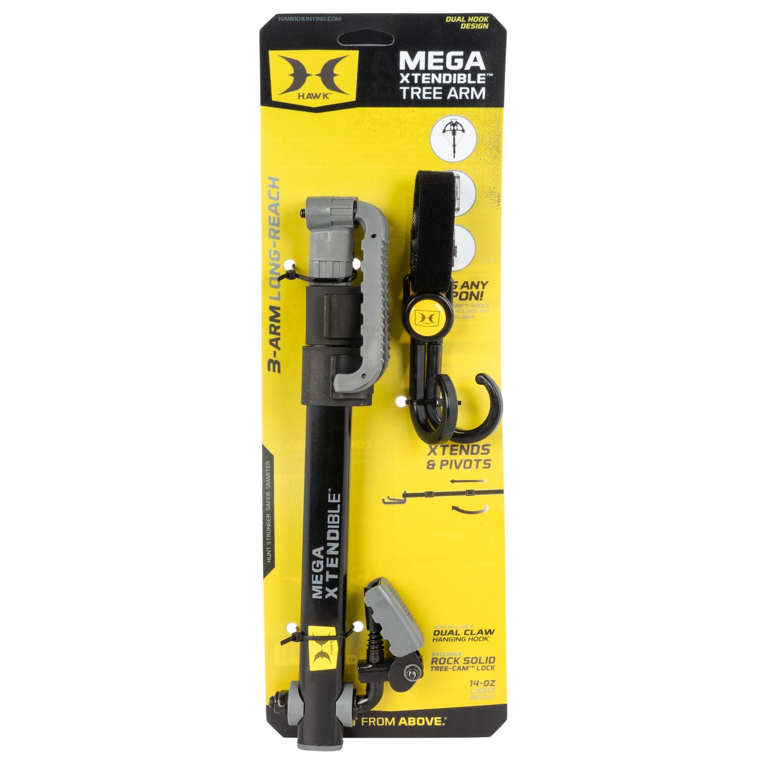 Hawk’s took their most popular tree arm and made it stronger and more versatile. The MEGA Xtendible is only 12” when collapsed but extends up to 25.5” for that longer reach and weapon placement in the tree. Made of aircraft-grade aluminum for lightweight portability and includes our exclusive Anti-Spin TreeCam for rock-solid performance. Dual Silent-Grip rotating hooks are great for hanging crossbow or extra gear by your side. Sharp Auger-Tip Threads easily screw into any hardwood. Includes CLAW Hanging Hook swivels.