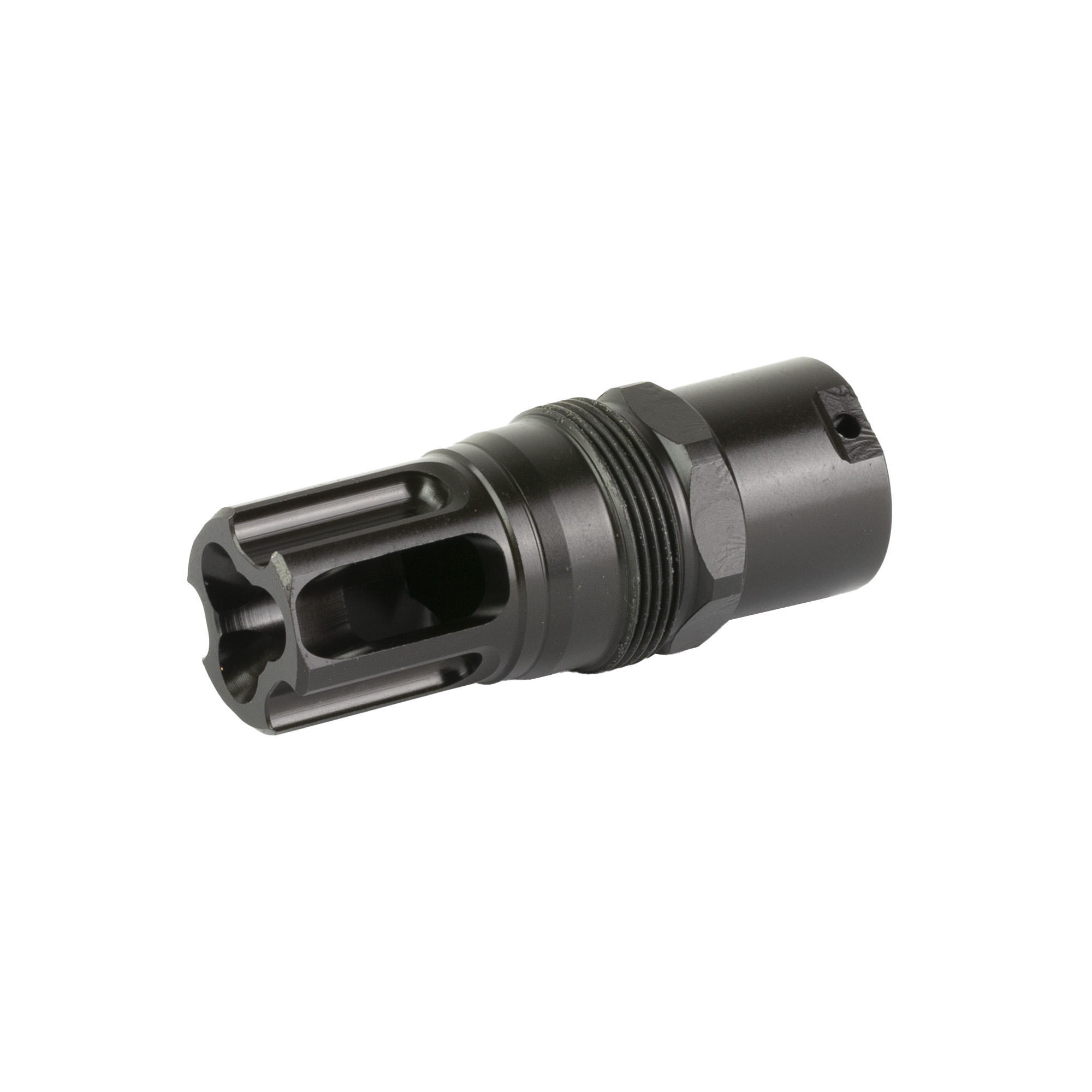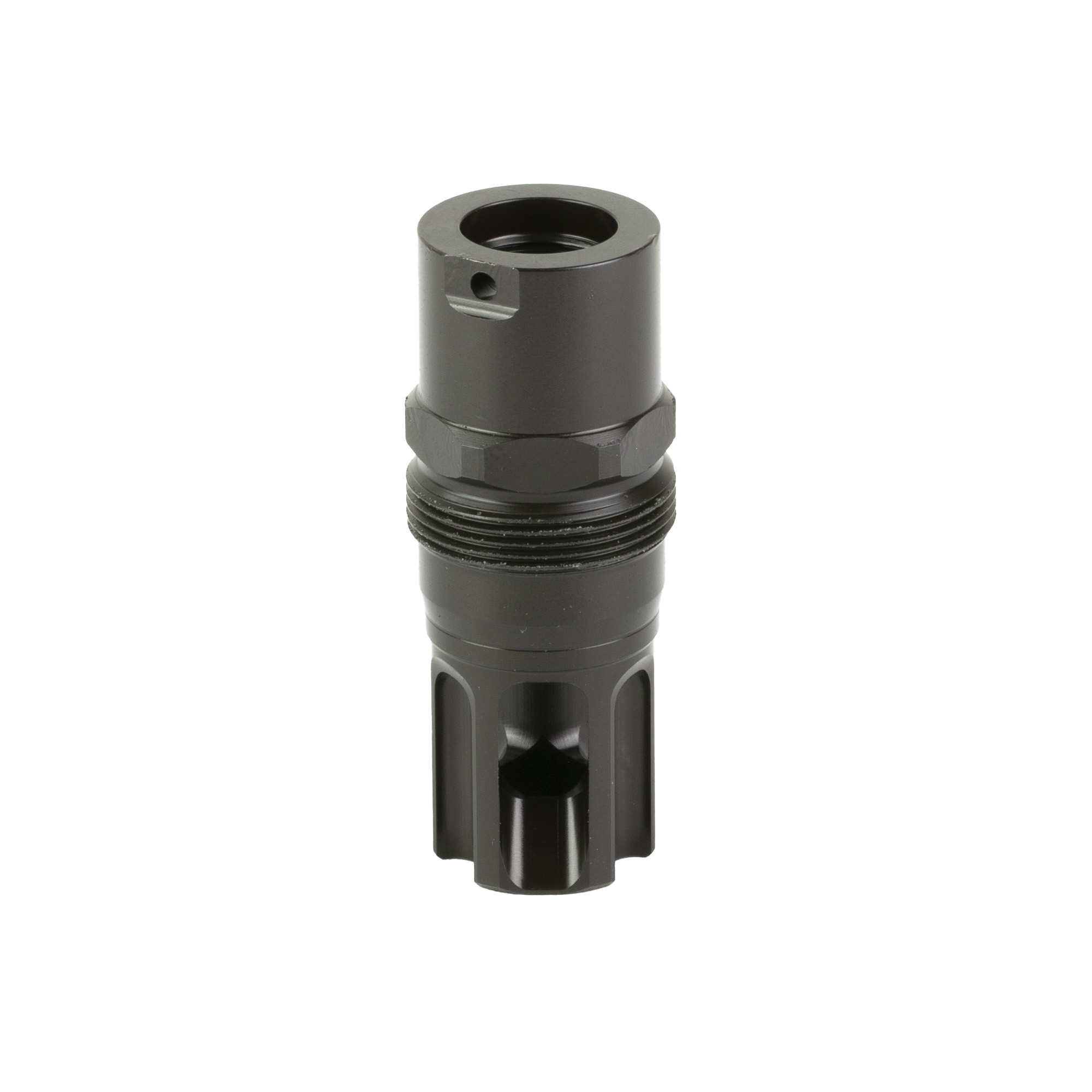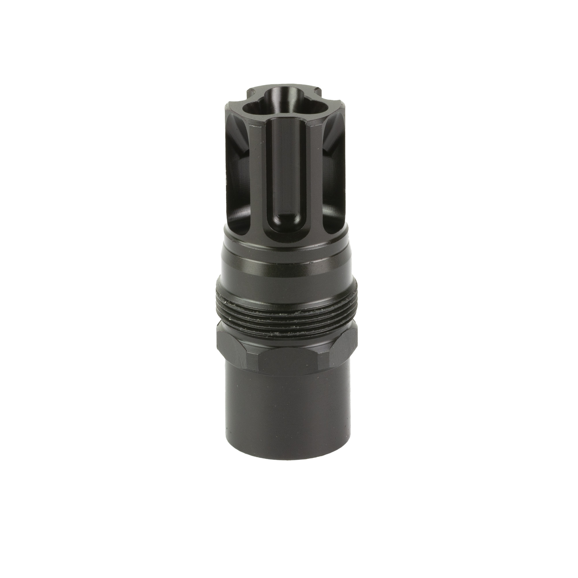 2.25 total length takes 14.5 barrels to 16.1 for legal rifle barrel length requirements. All critical alignment features machined in one set up. Compatible with common .900-24 silencer mounts like the Q Plan-B and Rearden MFG Atlas. .30 caliber bore. 13/16 rear hex for easy installation and removal. CNC machined from 17-4 PH stainless steel. Heat treated to H900 condition. Substantial flash reduction over OEM part. Designed to serve as sacrificial blast baffle. Square shoulder. 360 degree port orientation-no shims required. 2.7 ounces, 3/32 pin compatible