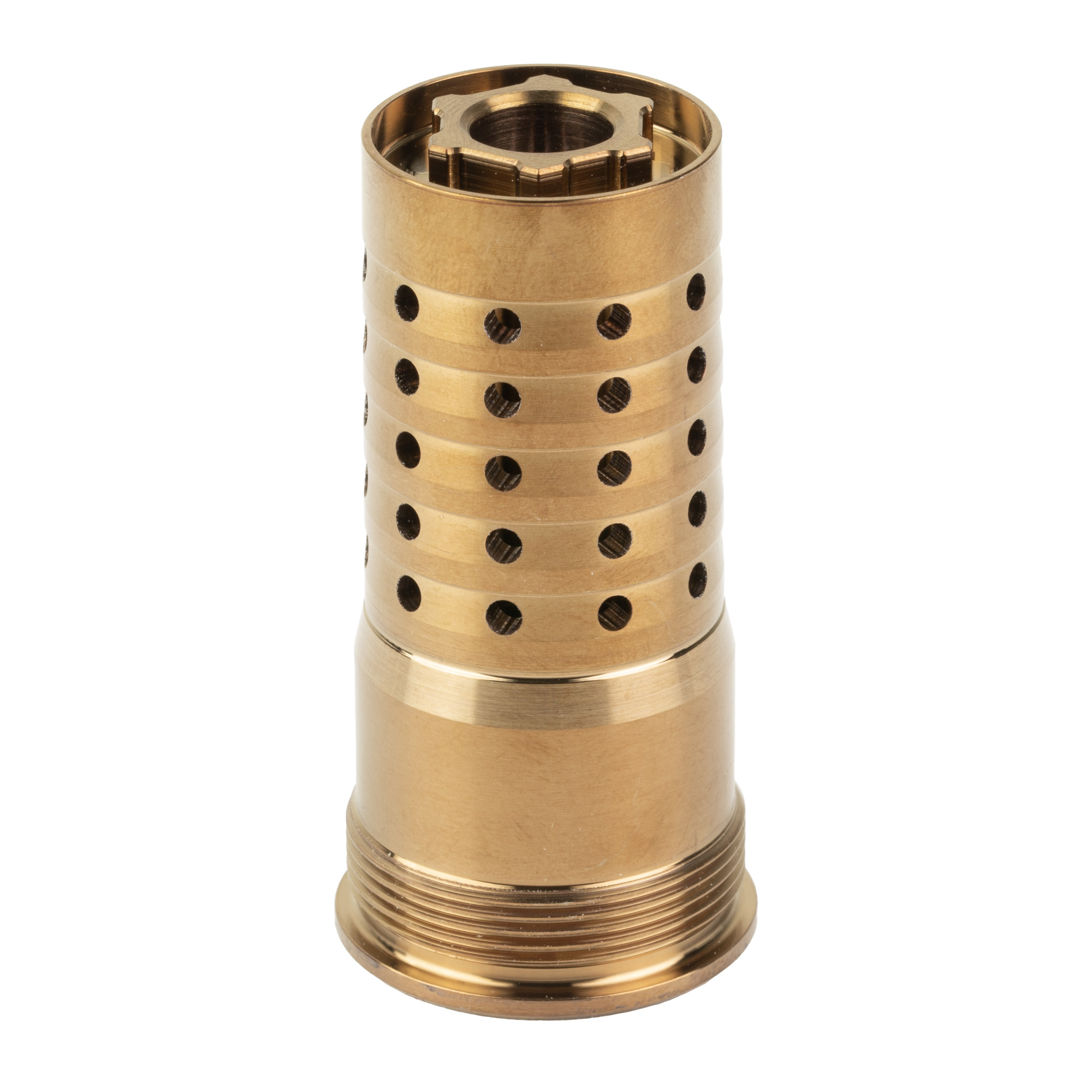 The Cherry Bomb by Q is a Quickie Fast-Attach muzzle brake compatible with the PORQ CHOP and short CHOP silencers by Q. It features the taper mount shoulder to align with the barrels and silencers, uses a 9/16 inch socket on the front for easy install and removal, and features 360 circumferential ports to alleviate the need for timing and shims. Backwards compatible with standard 90 degree shouldered barrels.