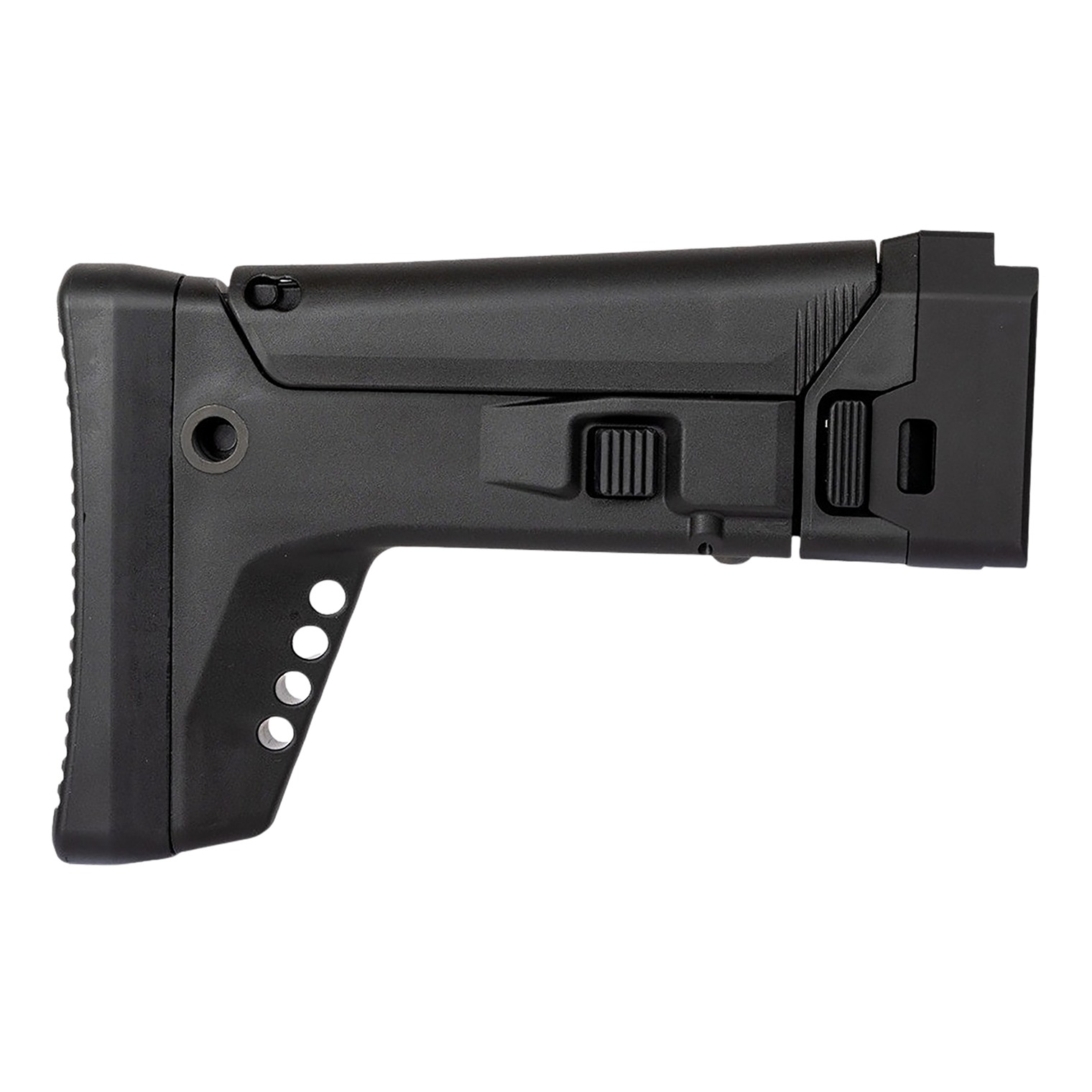 The Global Ordnance UFS 1913 Universal Folding Stock in Black is built for versatility and strength. Designed to mount securely to any 1913 Picatinny rail back plate, this stock has been tested across a wide range of firearms for a reliable universal fit. Its anodized aluminum adapter features a multi-adjustable set screw system, allowing shooters to fine-tune positioning for their preferred setup. Made from durable polymer, the stock offers seven length-of-pull adjustments, an adjustable cheek riser, and left-side folding for compact storage. A built-in battery compartment with a rubber cap keeps spare batteries or small parts secure and protected.