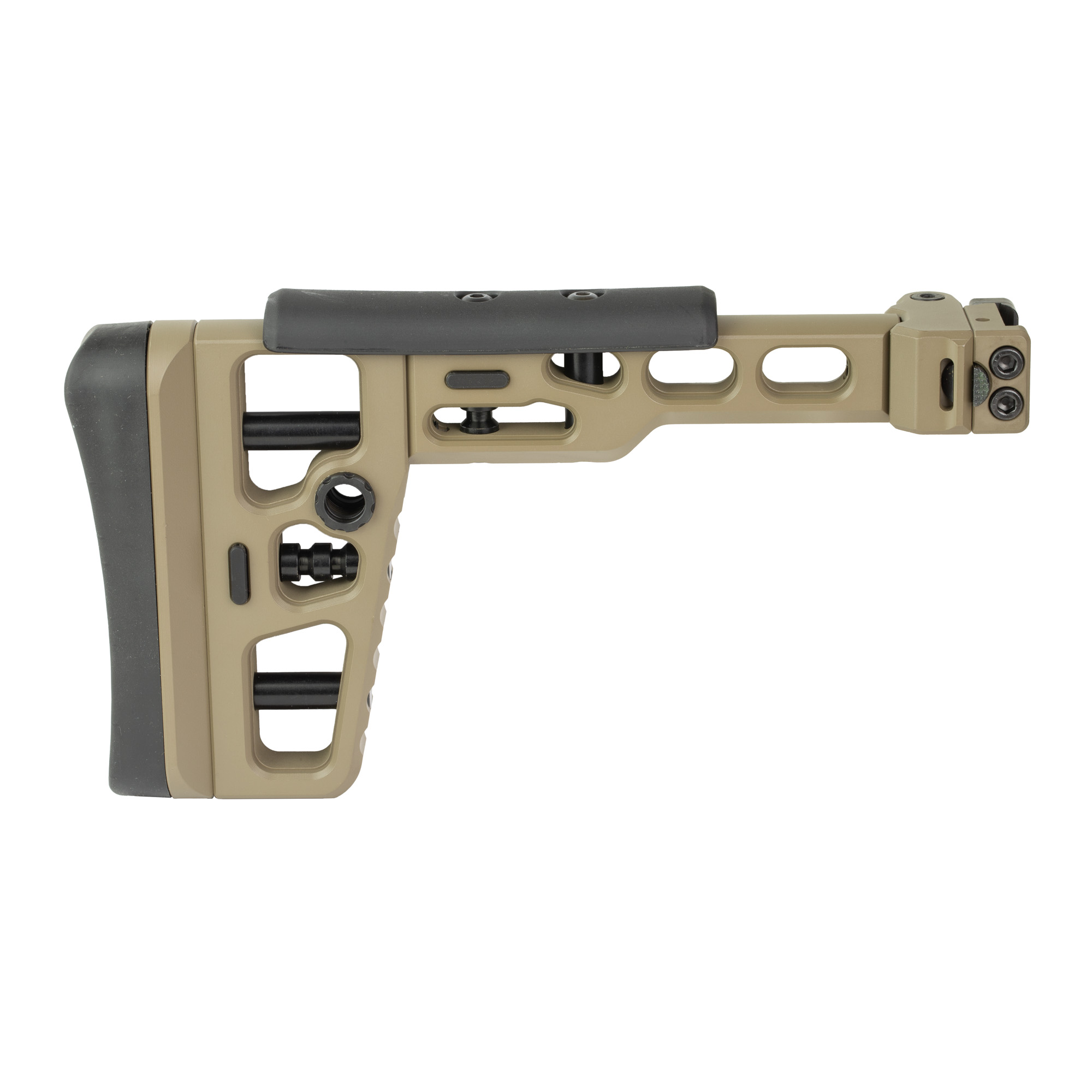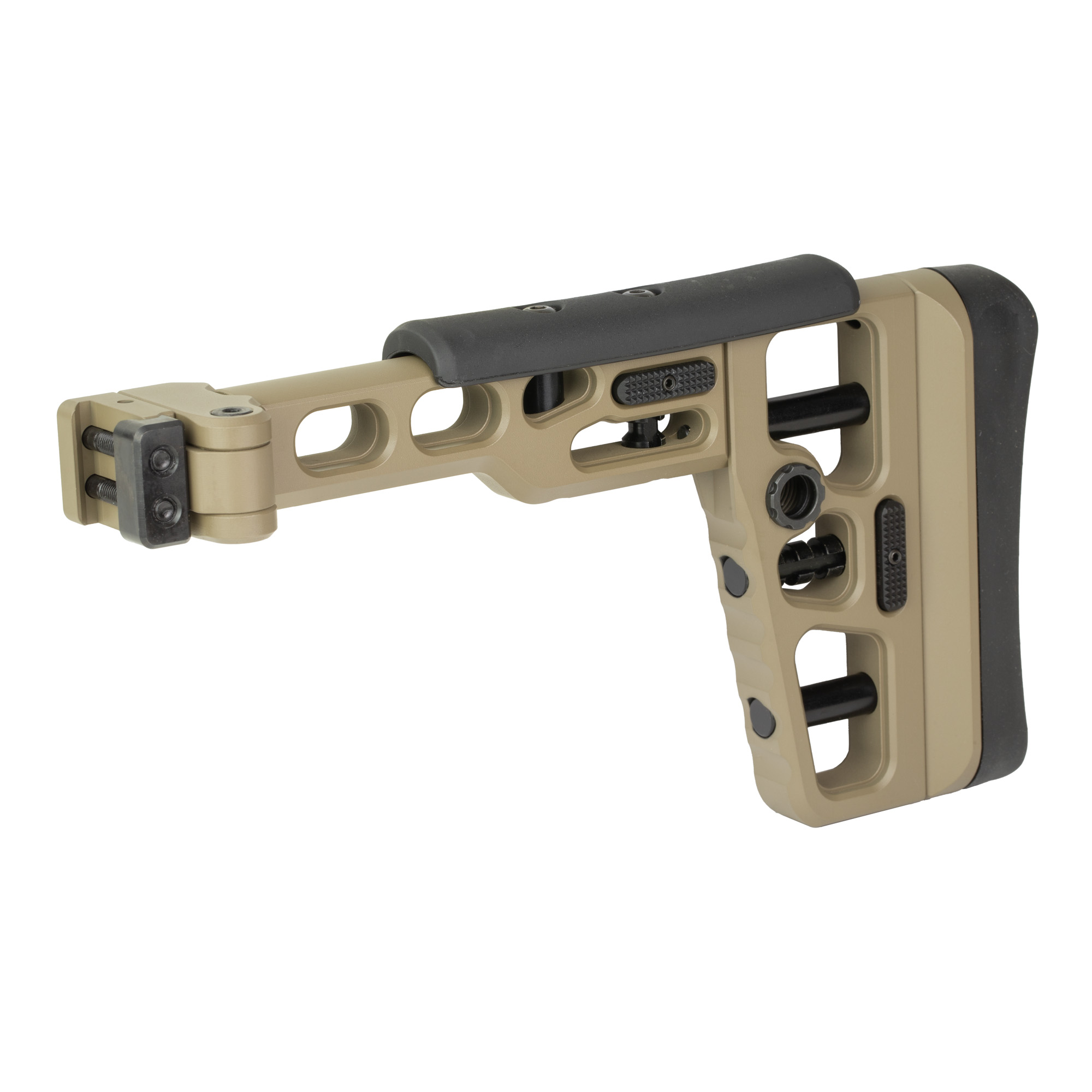 No spinny wheels, no tools required, just push-button adjustability on the fly. This easily adjustable metal folding stock provides a streamlined and formidable solution for those who demand peak performance in tactical scenarios. The S.A.S. K folding stock is skeletonized to eliminate unnecessary bulk, allowing firearms to achieve a lean and focused profile without compromising on operational capabilities. Ideal for individuals who value tactical performance and a sleek aesthetic. The folding mechanism allows for swift adaptability, ensuring firearms transform into a compact powerhouse at a moment’s notice. The S.A.S offers an unparalleled upgrade to your firearm’s tactical capabilities. Easy to use spring loaded button for four position height adjustment (0.7” adjustment). Two position placement front to back. Clearance for charging handle on AR style platform. Ambidextrous steel QD sling points, Folding Mechanism can be removed and reattached for right side fold, Durable and comfortable rubber butt pad, Textured vertical support for shooting while prone, Designed not to obstruct trigger guard and safety selector when folded, Skeletonized to reduce weight. Easy to use spring loaded button for five position length of pull adjustment (1.25” adjustment)