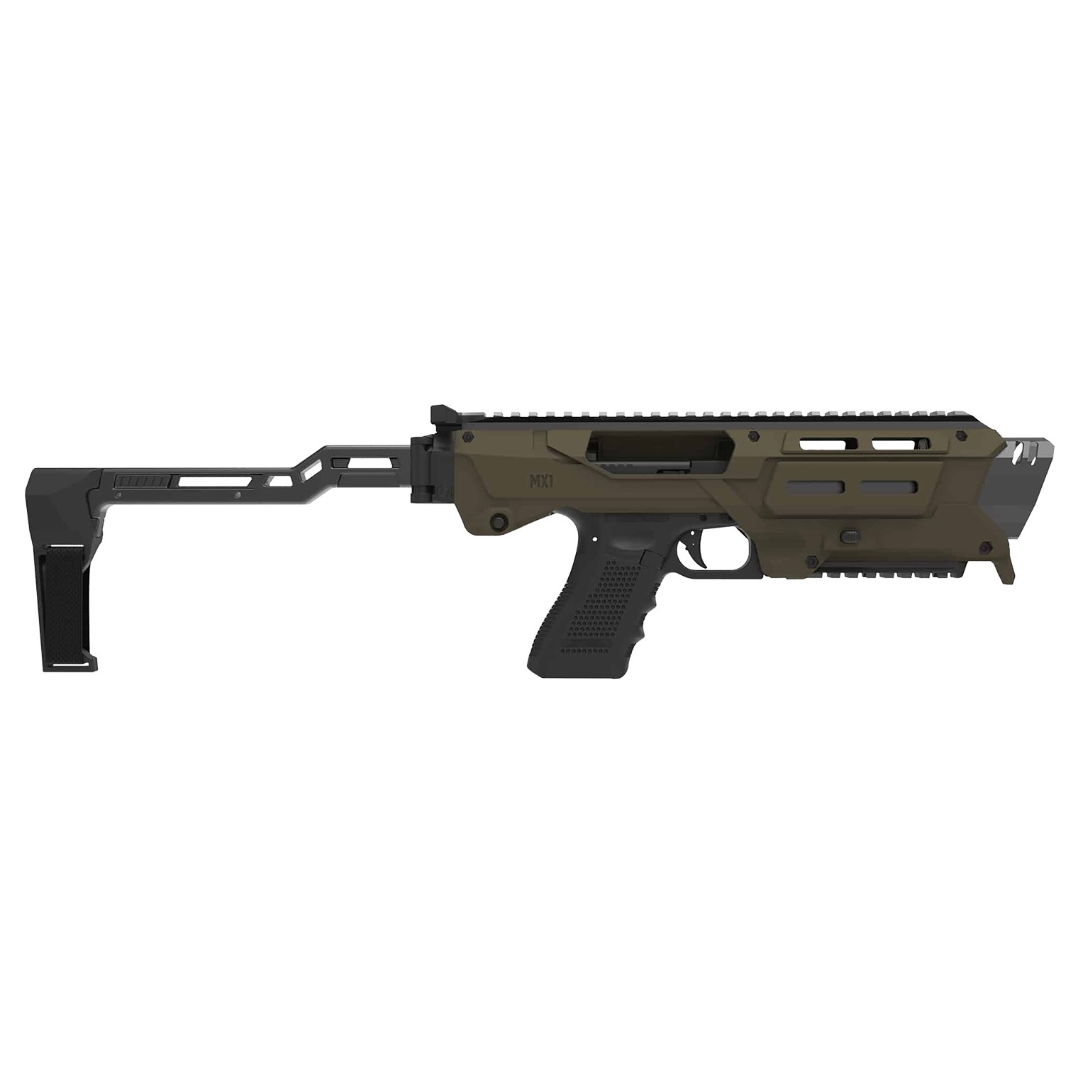 The MX-1 all-in-one chassis compatible with 70+ Glock models. Designed for versatility, durability and enhanced performance, this compact system transforms Glocks into a precision-driven platform for tactical use, home defense and range training. Equipped with M-LOK and Picatinny rails, polymer stabilizer with aluminum core. The MX-1 is ready for accessories like optics, lights and grips.