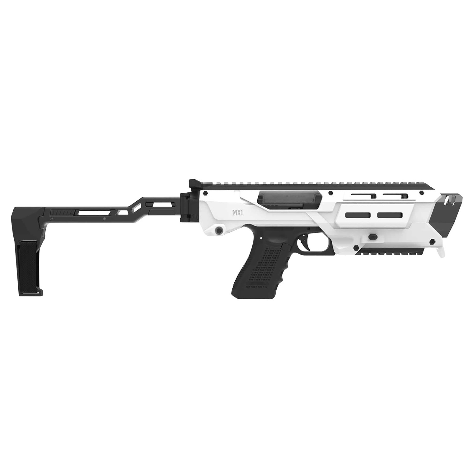 The MX-1 all-in-one chassis compatible with 70+ Glock models. Designed for versatility, durability and enhanced performance, this compact system transforms Glocks into a precision-driven platform for tactical use, home defense and range training. Equipped with M-LOK and Picatinny rails, polymer stabilizer with aluminum core. The MX-1 is ready for accessories like optics, lights and grips.