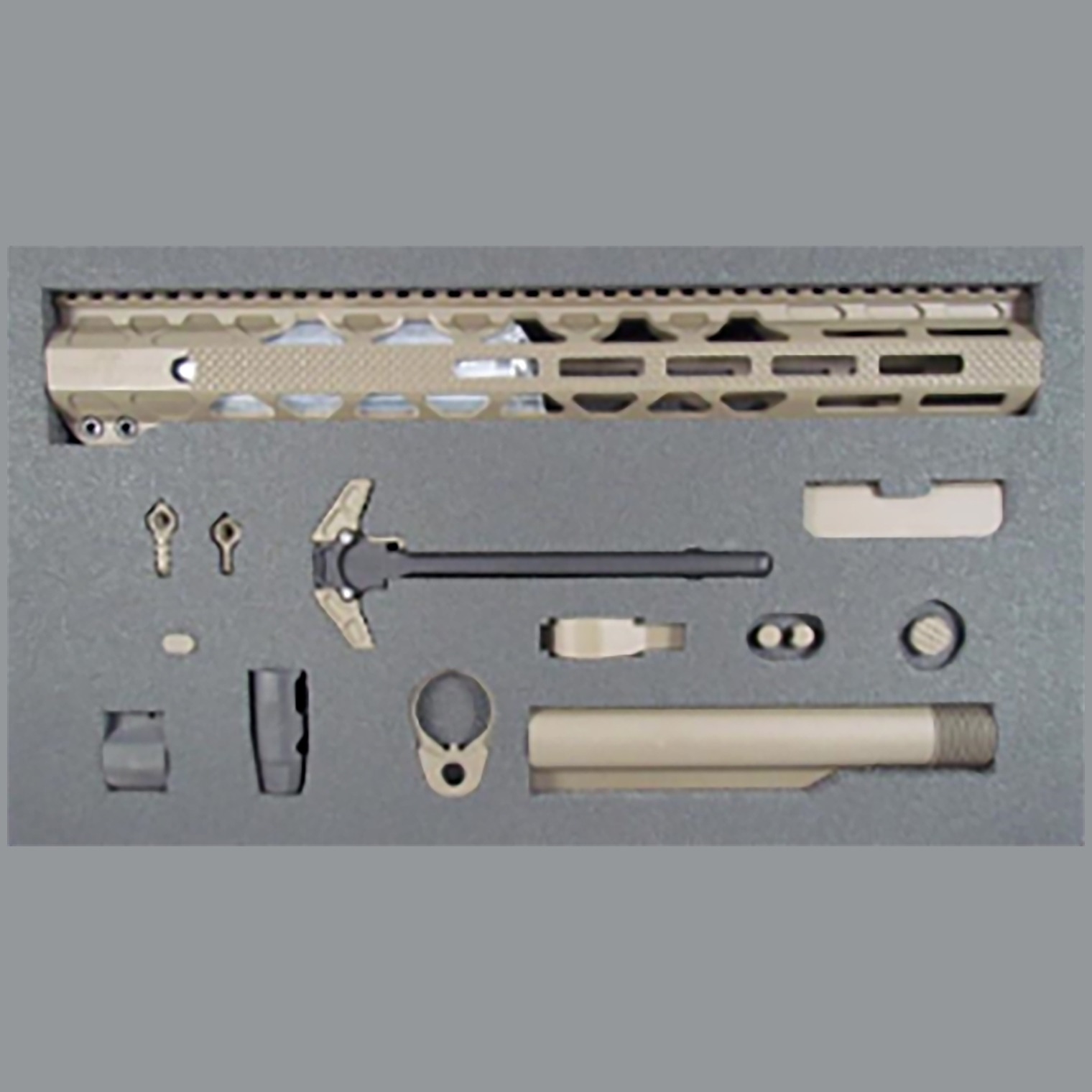 Greyman comes in Type III Hard Coat Black, and 4 custom earth tone colors specific to the series. The New Charging Handle has smaller wings in size to make it more streamlined to the rifle. With rounded edges to prevent any snagging on gear while incorporating the new texture. This makes for more positive contact and a better grip while operating. The New Handguard features the cross-hatch throughout for a better grip. We’ve taken the front QD’s off, making it a flat front that mounts great with cans. The Build Kit is a 12 piece upgrade kit, that includes New Adjustable Dust Cover. We’ve also upgraded to a Steel End Plate and Steel Plus Pins for a tighter lock up all around.