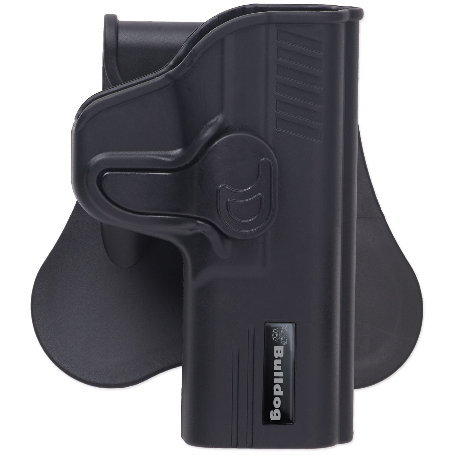Bulldog’s Rapid Release Holster is suitable for civilian, duty and military use. The holster is made of durable, high-tech polymer material with gun-specific design that is fully adjustable to multiple draw positions. Its specially designed locking mechanism provides safe and secure “Level II” retention while offering a one finger “Quick Draw” release.