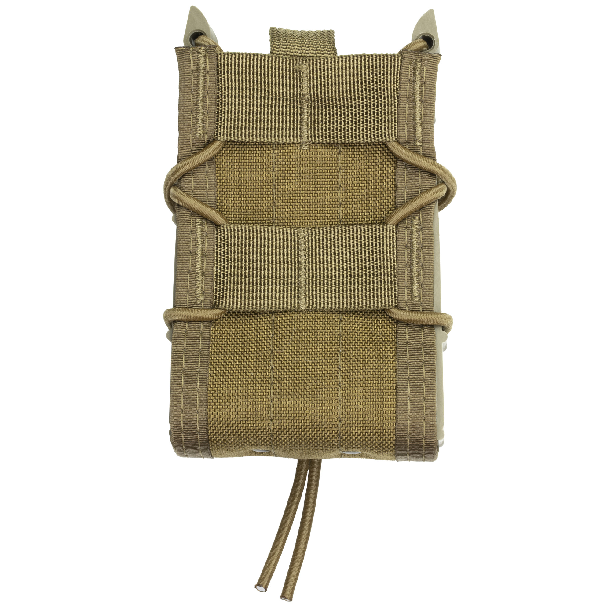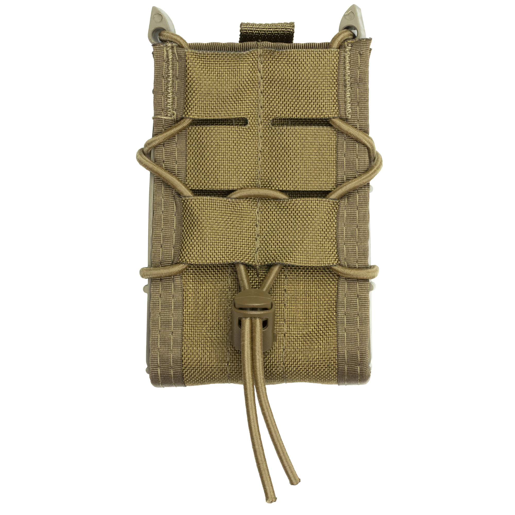 This pouch uses injection molded polymer sides, Cordura front and back and shock cord lacing to lock just about any rifle magazine into place. USGI, HK, PMAG, ARC, FAL, AK 30//40, LR20 and M14 magazines are all held securely and deployed easily and silently on demand. The TACO even works for certain radios, flash bangs and smoke grenades and provides this versatility while taking up only 3” horizontal inches on your platform. The TACO maintains a positive, adjustable grip on its contents without additional securing systems. However, if additional retention is desired webbing tabs are sewn in on the top for use of “over the top” bungee retainers and loop Velcro is sewn on the interior if the users wish to use adhesive hook on the magazine.