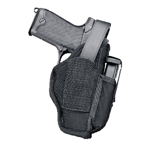 The Sidekick Hip Holster is a versatile holster with magazine pouch and removable belt clip. The velcro retaining strap secures magazine yet provides easy access. It is constructed of tough, patented sidekick laminate of cordura nylon, waterproof closed cell foam padding and smooth nylon lining. The non-stretch retention strap and molded thumb break are anchored by one-way velcro inside of the strap trap. Adjustment tool included. This model is compatible with your 4.5-5” barrel large auto.