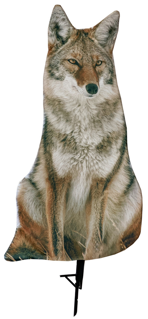 The Sitting Coyote new for 2023 entices wary coyotes to come closer. Built off an actual picture of a coyote in the wild the calm sitting pose and forward look implies curiosity and comfort. Designed for quick set up and folds for easy transport. Add more realism to your calling set ups with this visual enticer. Increase your success during any part of the coyote hunting season. Leg pole included. - Unfolded: 31 x 16 - Folded: 9 x 10 - Weight: 13.5 oz with pole