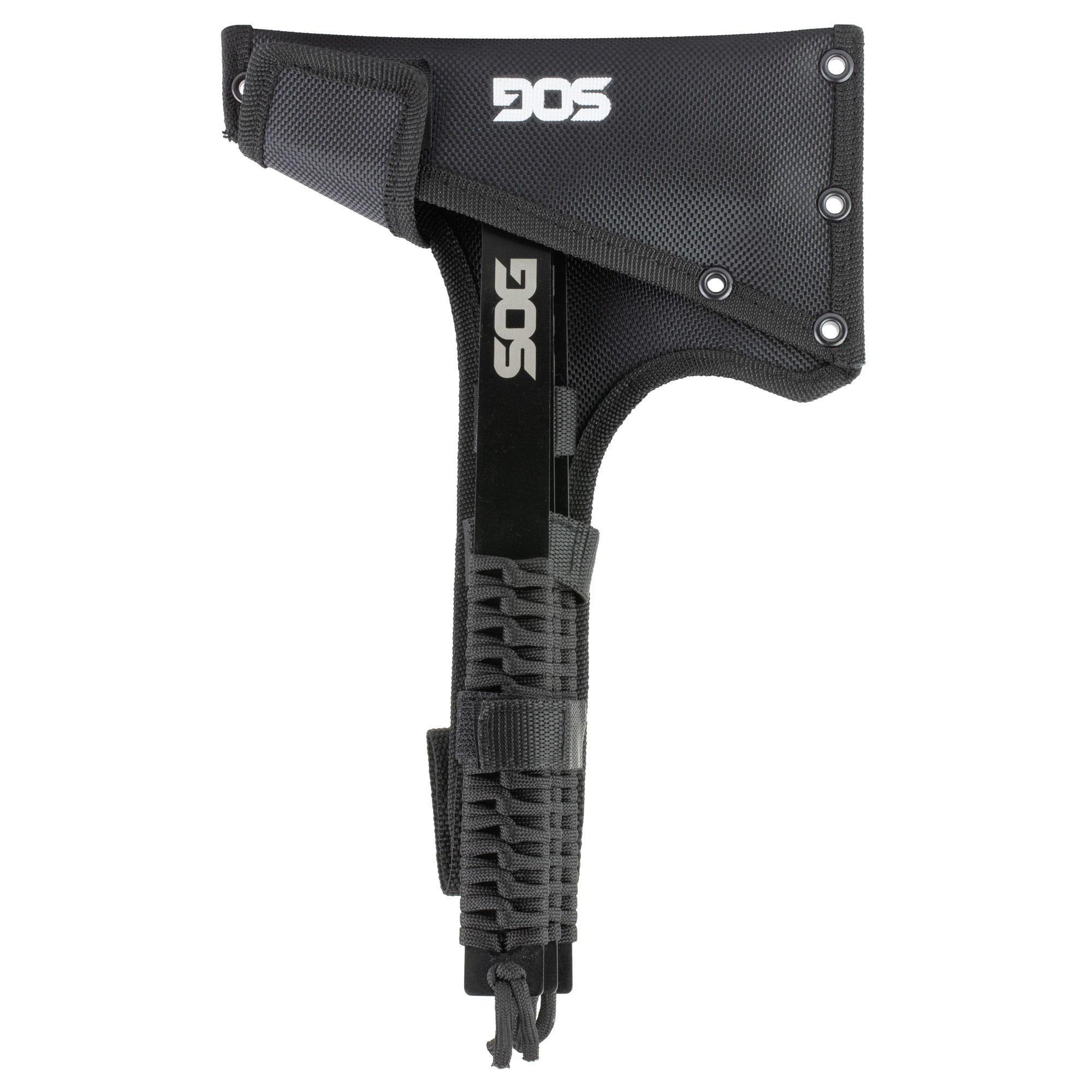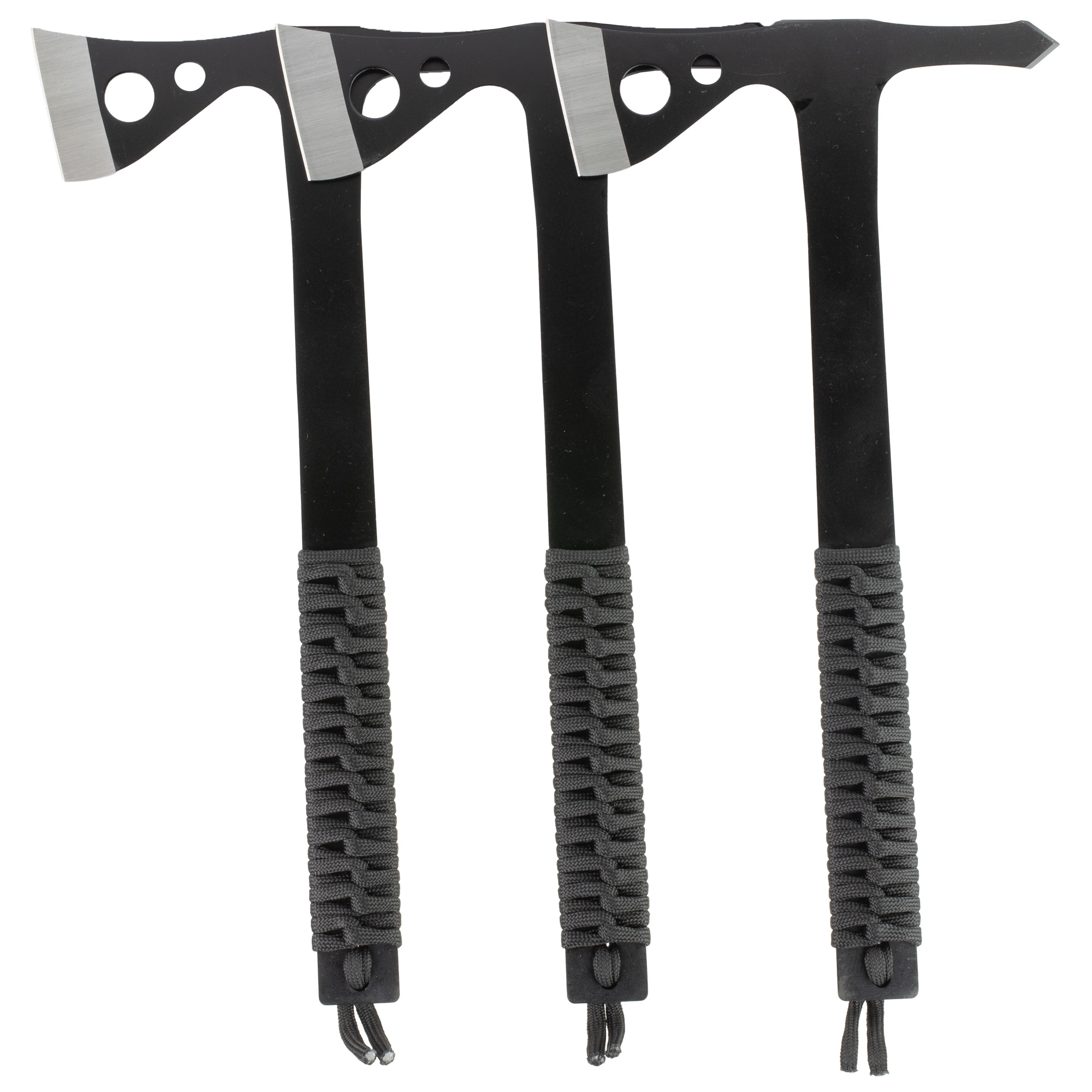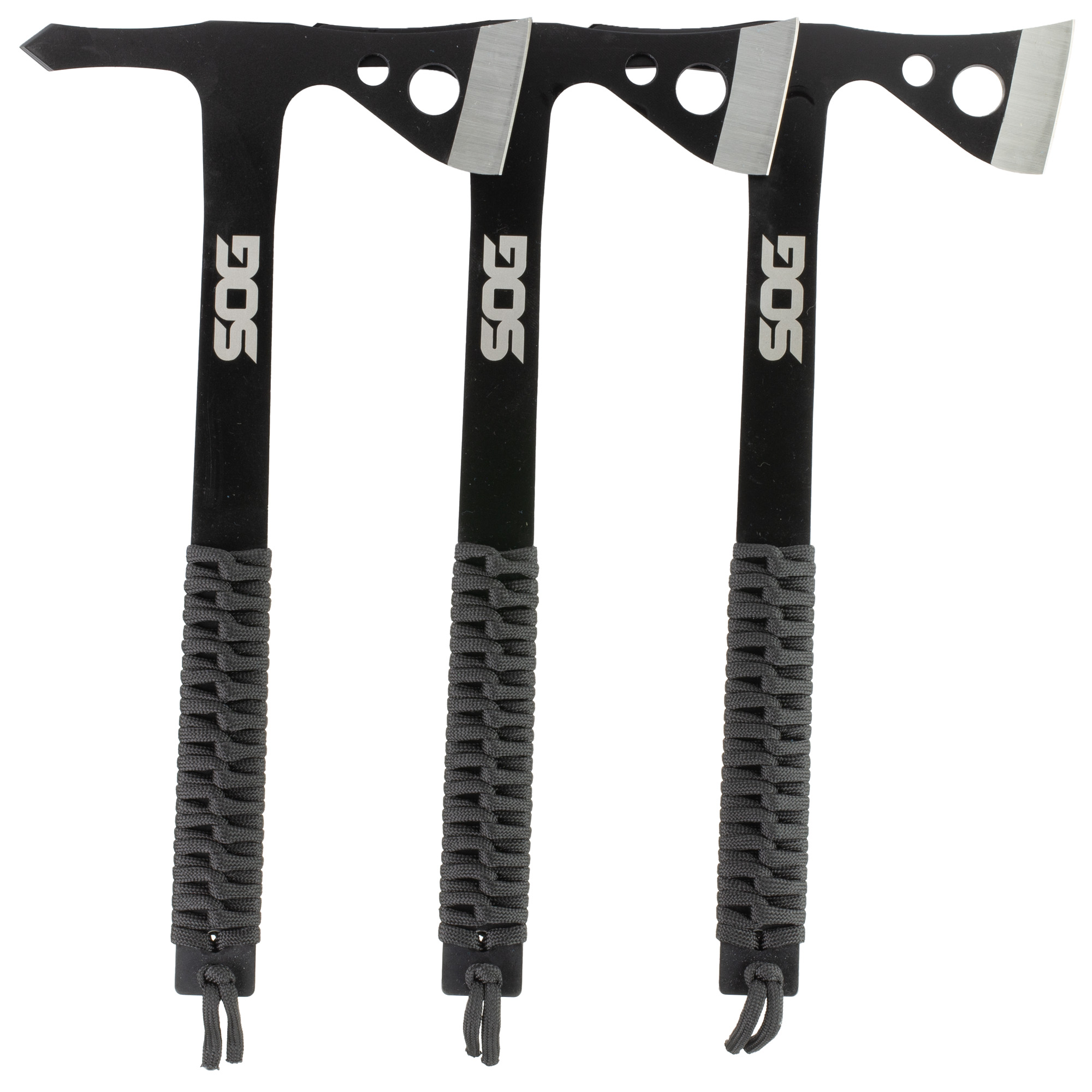 Take target throwing to the next level with the Throwing Hawk set, three pack of one-piece steel hawks with paracord wrapped handles designed for specifically target throwing. Challenge your friends for supremacy of the back yard. These stylized Throwing Hawks are not only fun to sail through the air, they are practical as well. Protected by SOG’s hard cased black coating, they are extremely scratch resistant. Their balance, aerodynamics, and proportions make them great throwing hawks. For the same reasons, they also make great back-up field tools. Handles are wrapped with paracord or use without it and you have three tomahawks for the price of one. Includes nylon sheath that safely carries all three.