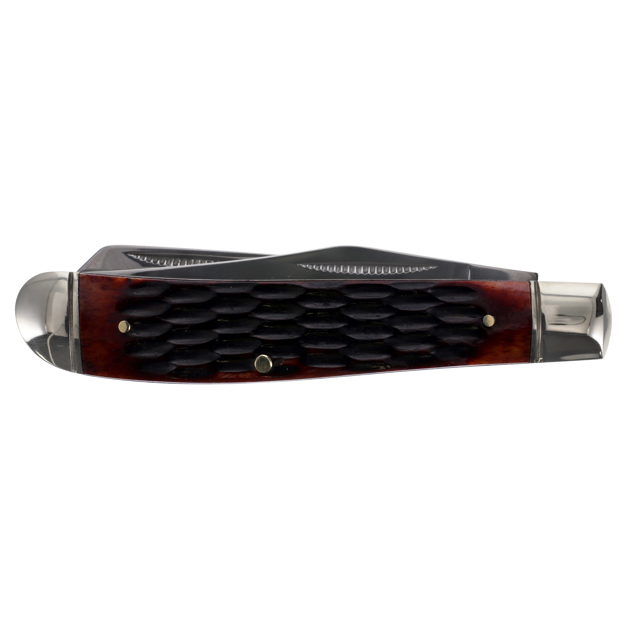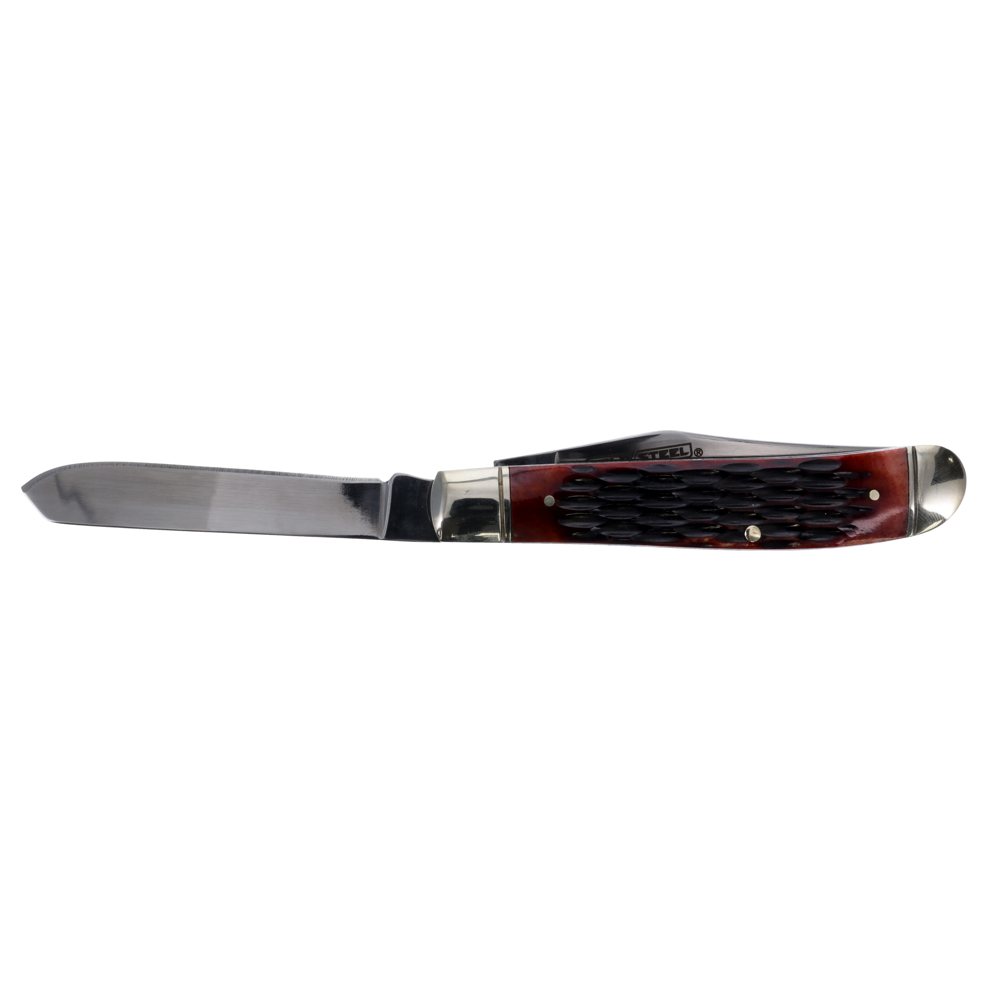 The Cold Steel Trapper Folding Knife is Cold Steels variation on the classic slip joint Trapper knife. It features handles with authentic bone and are highlighted with polished metal bolsters. The rugged handles are substantially sized for hard work, even with gloved hands. It is constructed in a traditional Jack Knife pattern, with two polished blades: a clip point blade for piercing and cutting and a spey blade for skinning and gutting.