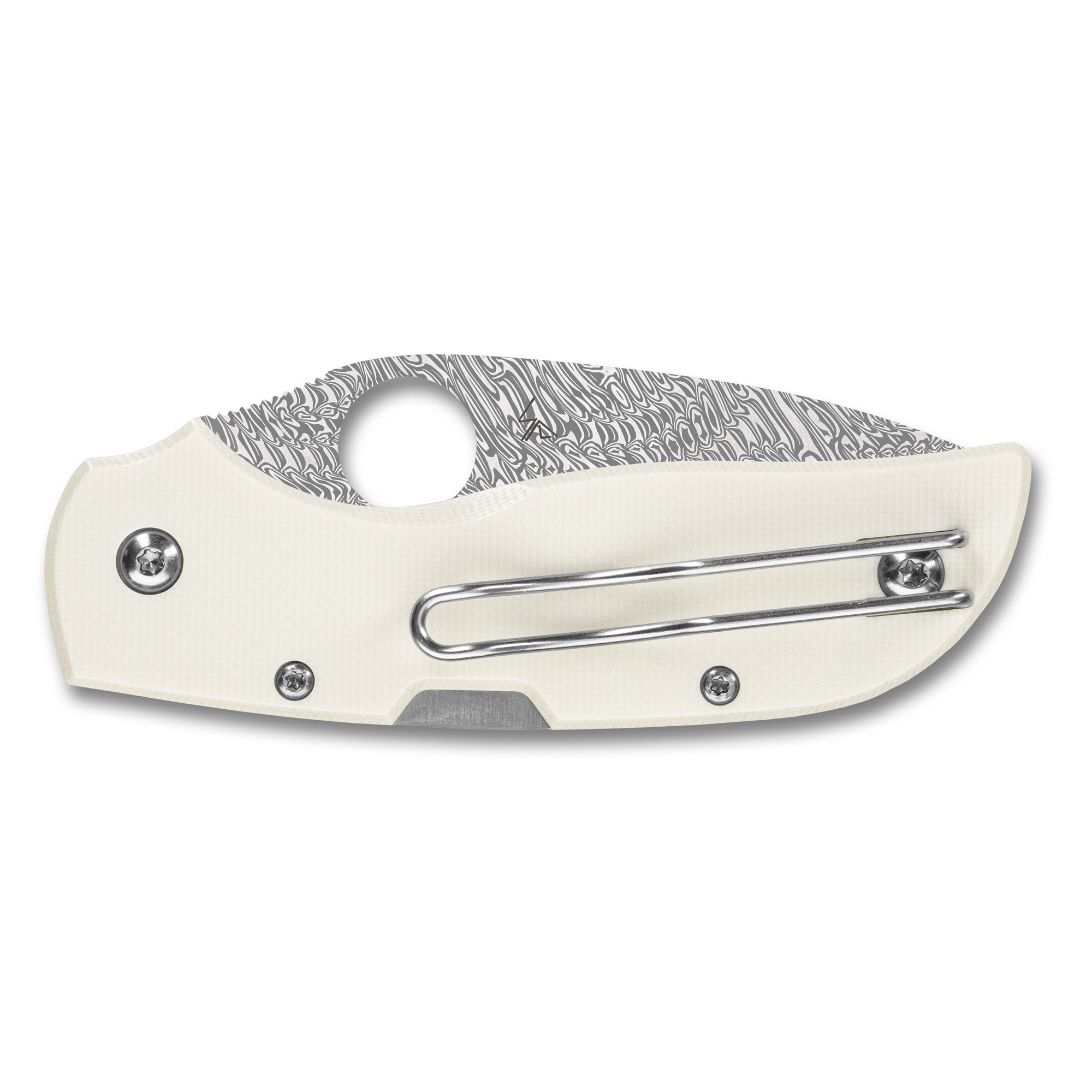 Spyderco, Chaparral, Folding Knife, 2.8” Drop Point Blade, 6.4” Overall Length, Damasteel DS93X Grabak Blade Steel, Plain Edge, Damascus Finish, Silver, White G-10 Handle, Back Lock