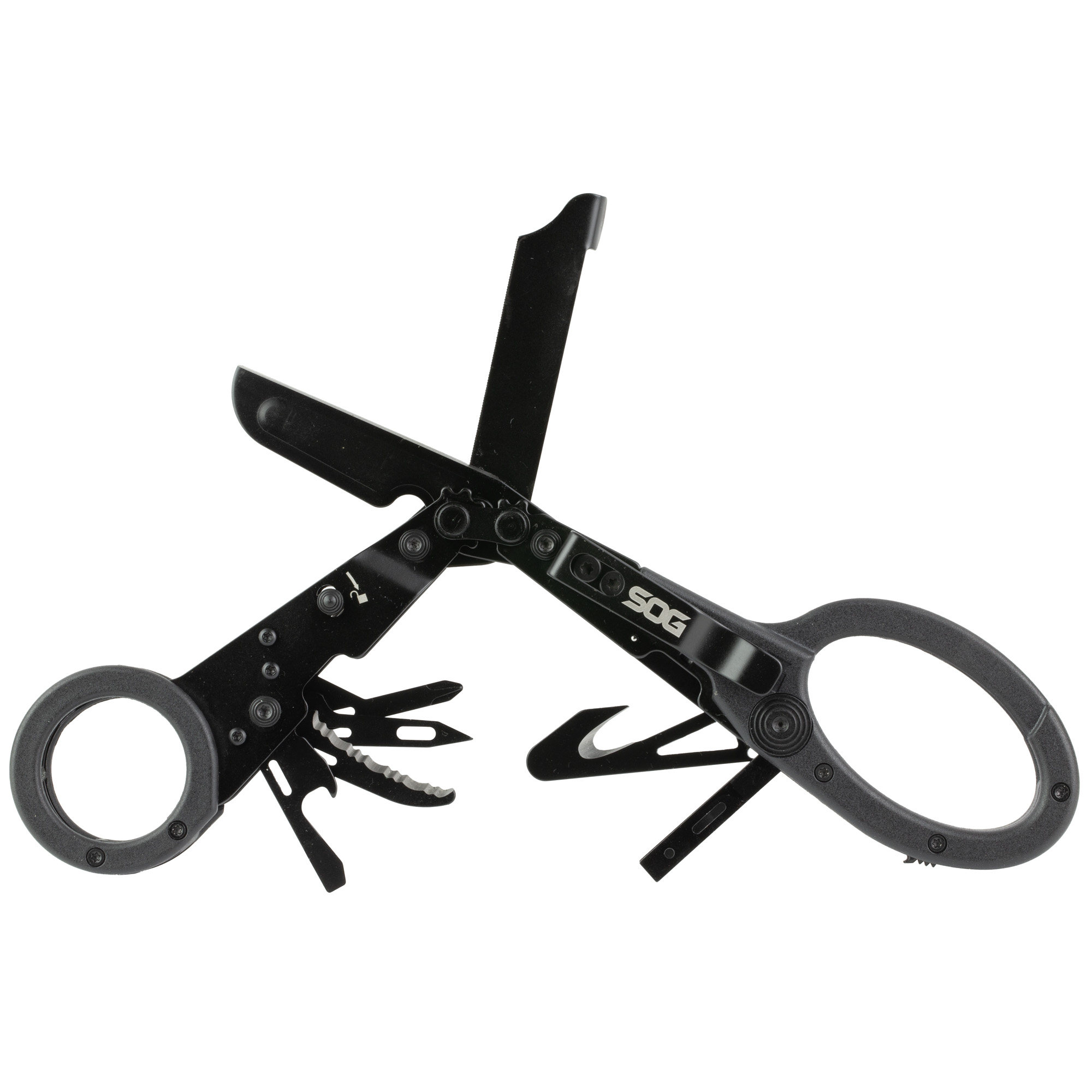 A focused multi-tool designed specifically for first responders, Leveraging SOG’s proprietary Compound Leverage technology, ParaShears are able to cut through material easier and quicker than equivalent shears. Capable and reliable, the ParaShears are a multi-tool designed for rapid, precise work under the most stressful conditions in medical applications. ParaShears come complete with a mission-specific toolset that features 11 components, including shears, strap cutter, glass breaker, oxygen wrench and tweezers. Including inch rule, mm rule, Shears, line cutter, glass breaker, tweezers, #1 Phillips, bottle opener, medium flathead, awl, rope cutter and O2 wrench.