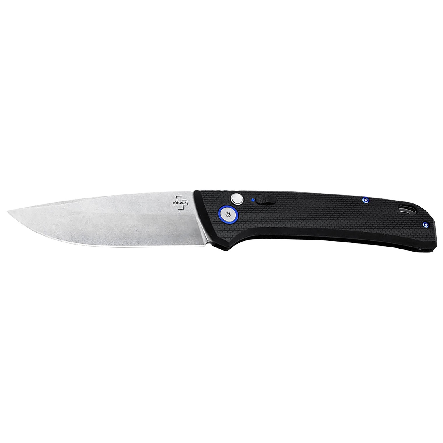 The Boker Plus FRND breaks free of the daily humdrum and invigorates as a varied and slim automatic knife with EDC character. The drop-point blade made of D2 opens by push button and has a gritty stonewash finish that makes small traces of use almost disappear even after hard use. The robust button lock with an additional slider doubly secures the blade during use and significantly minimises the risk of unruly cutting actions escaping. Accidental opening in a trouser pocket is also a thing of the past thanks to the safety catch. The textured Grivory handle scales provide a firm grip even in wet conditions and highlights the lightness of the pocket-knife. Decorative accents are set by the anodised screws and the blue-edged blade axle screw.