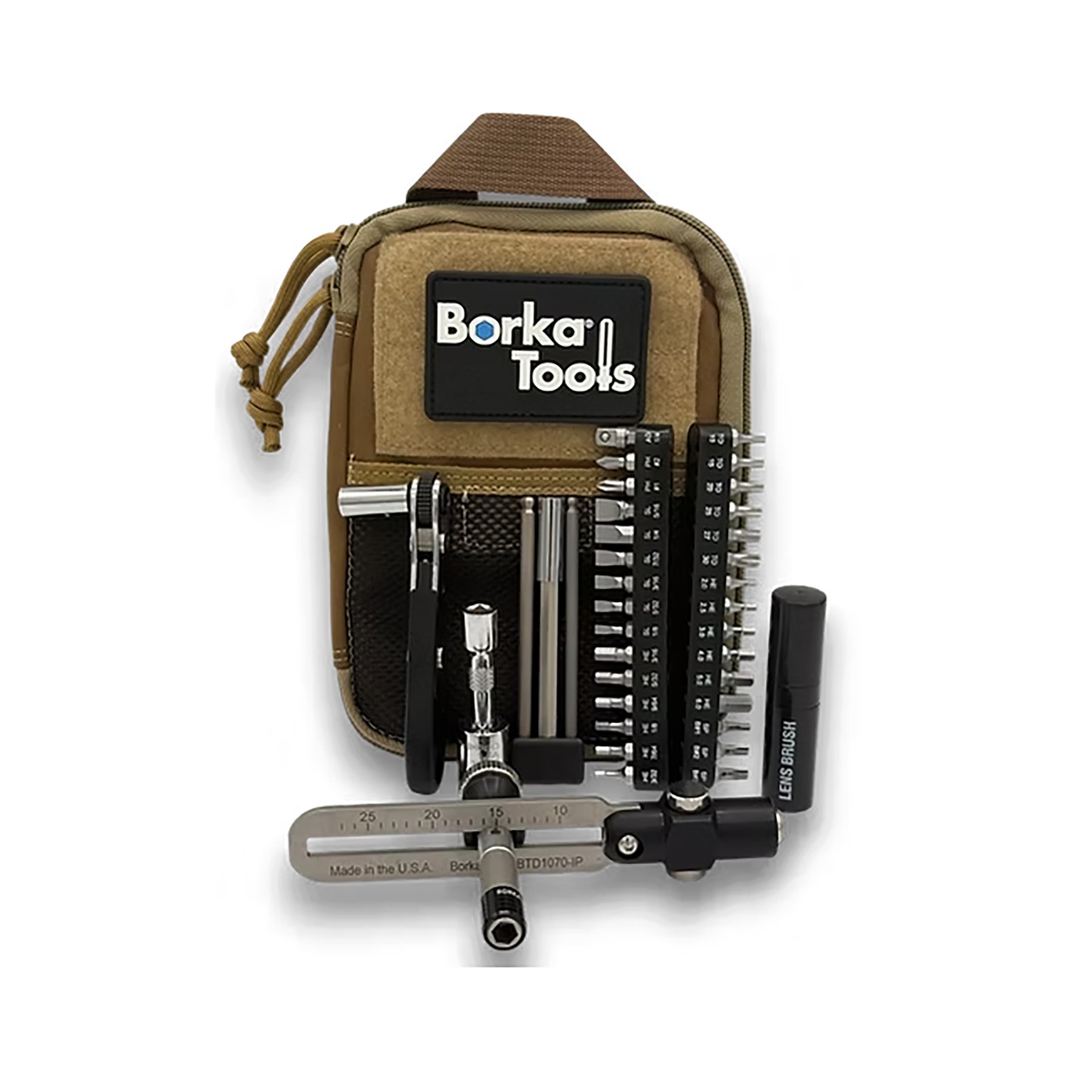 The Borka BTK-E1 takes the acclaimed Standard Configuration Kit and expands it for added versatility, longer reach, and specialized applications. Ideal for professional armorers, precision shooters, and serious enthusiasts who demand both accuracy and flexibility. The BTK-E1 includes everything in the Standard Configuration plus three purpose-built, extended-length components for hard-to-reach fasteners: 5/32” Ball-End Hex 4” Long Bit: Perfect for action screws requiring deep access, such as Ruger 10/22 V-block 10-32 clamp screws. 3/16” Ball-End Hex 4” Long Bit (Universal AICS Bit): Custom-engineered for Accuracy International Chassis Systems (Gen 1 & Gen 2) and other platforms using 3/16” hex socket action screws. 4” Long Bit Extension: Slim 0.4” maximum outer diameter for effortless clearance in tight channels. All extended bits are crafted from premium S2 tool steel, hardened to HRc 5860, and designed with ball-end tips for angled access without compromising precision. Complete Kit Contents: Adjustable Torque Driver, Torque calibration accuracy: 4%. Compact Ratchet Handle: 1/4” hex (F) x 1/4” square drive (M). Adapters & Extensions: 1/4” hex drive (F) to 1/4” square drive (F) adapter, 1/4” hex drive (M) to 1/4” square drive (M) adapter, 2” long extension with 1/4” square drive (M and F) ends, 1/2” hex socket with 1/4” square drive (F). Premium S2 Tool Steel Chrome-Plated Bits (29 total): Hex, Inch: 3/32, 7/64, 1/8, 9/64, 5/32, 3/16. Hex, Metric: 2, 2.5, 3, 4, 5, 6. Slotted: 1/8, 5/32, 3/16, 7/32, 1/4, 5/16. Torx: T-10, T-15, T-20, T-25, T-27, T-30. Phillips: #1, #2. Spare Torx Bits: T-10, T-15, T-20 (stored in labeled Special Bits slots SPB#13). Additional Essentials: Mohair lens brush, Cordura nylon pouch (approx. 8” x 5.5” x 2”), Instruction guide sheet with quick-start info and links to video guides. Unmatched versatility for firearms maintenance, optics mounting, and field service, Ball-end hex design for angled access and extra reach in confined spaces, Rugged Cordura pouch organizes and protects every component, Built to exacting Borka standards for precision, strength, and longevity, Accuracy and Quality you can count on. Made in the USA with professional-grade materials, Weight: 1 lb. 6 oz.