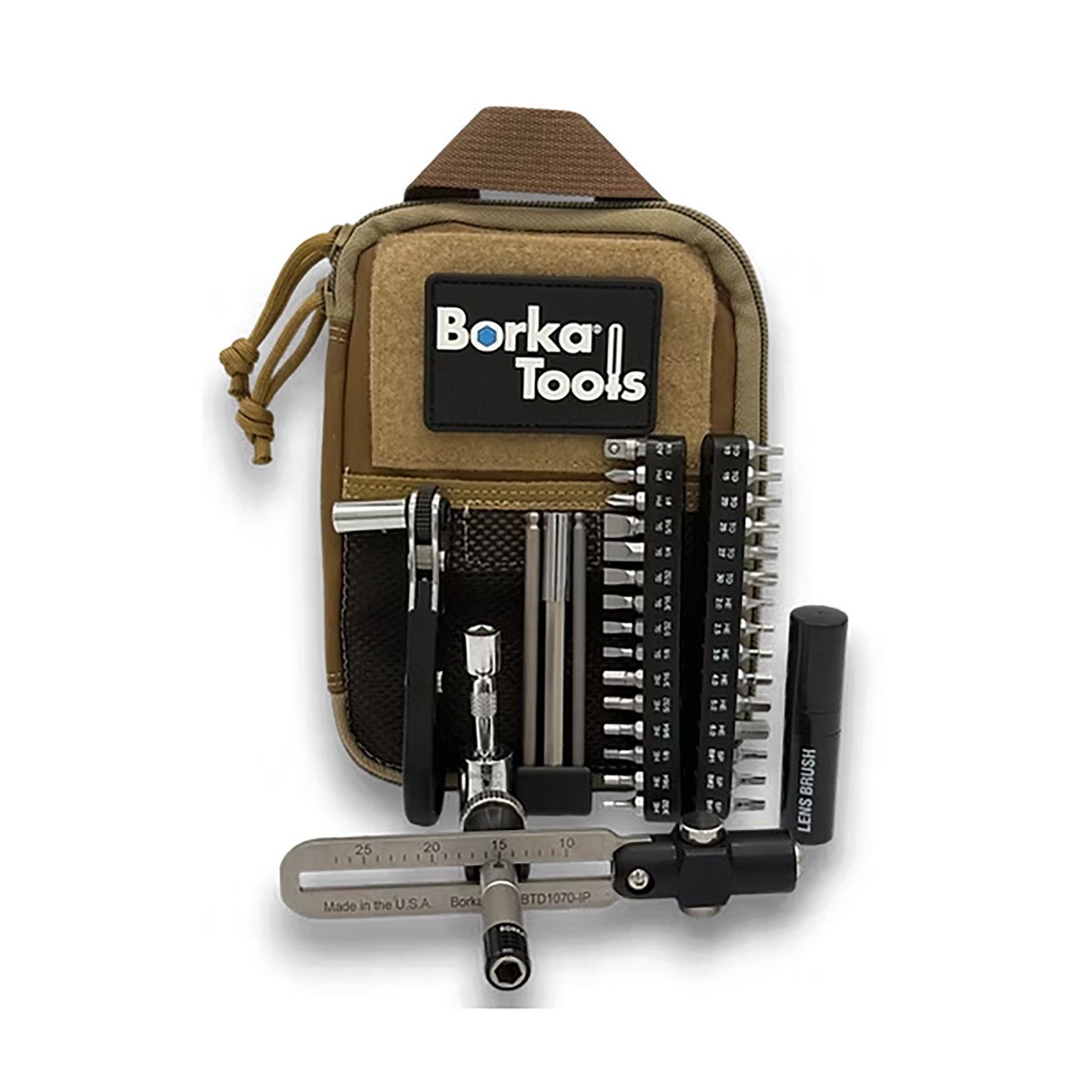 Borka Standard Configuration Precision Torque Kit, Precision Meets Portability. The Borka Standard Configuration Kit delivers professional grade torque control in a compact, rugged package. Complete Kit Contents: Adjustable Torque Driver, Calibrated to an accuracy of 4%. Compact Ratchet Handle: 1/4” hex (F) x 1/4” square drive (M). Adapters & Extension: 1/4” hex drive (F) to 1/4” square drive (F) adapter, 1/4” hex drive (M) to 1/4” square drive (M) adapter, 2” extension with 1/4” square drive (M and F) ends, 1/2” hex socket with 1/4” square drive (F). 29 Premium S2 Tool Steel, Chrome-Plated Bits: Hex, Inch: 3/32, 7/64, 1/8, 9/64, 5/32, 3/16. Hex, Metric: 2, 2.5, 3, 4, 5, 6. Slotted: 1/8, 5/32, 3/16, 7/32, 1/4, 5/16. Torx: T-10, T-15, T-20, T-25, T-27, T-30. Phillips: #1, #2. Spare Torx Bits: Extra T-10, T-15, T-20 (stored in labeled Special Bits slots SPB#13). Maintenance Essentials: Mohair lens brush, Instruction guide sheet with quick-start info and video links. Cordura Nylon Pouch Heavy-duty 8” x 5.5” x 2” case keeps everything organized and protected, Total Weight: 1 lb. 6 oz. Key Advantages: True 4% torque calibration accuracy for repeatable, precise fastener tension, Lightweight, portable design for on-the-go gunsmithing, optics installation, and field maintenance.