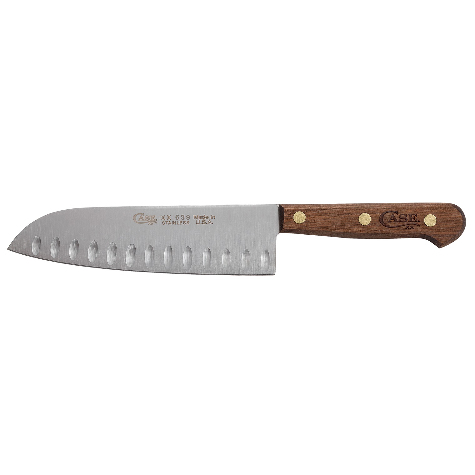 The classic Santoku Knife is part of the Household Cutlery collection. It features a 7” stainless steel Santoku blade with a solid walnut handle and a full tang. This knife is great for slicing, dicing and mincing. The Santoku knife can create razor-thin slices of meat and fish. Constructed with Case Tru-Sharp stainless steel which is a special high-carbon steel that helps the blades hold an edge longer than conventional steel, extraordinary blade strength and corrosion resistance. Comes packaged in a clamp pack. Made in USA from domestic and imported materials.
